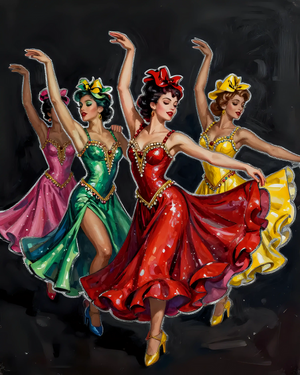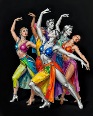 Four Elegant Dancers in Vibrant Costumes