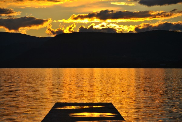 A dock on Okanagan Lake with puddles of water bringing the background, forward