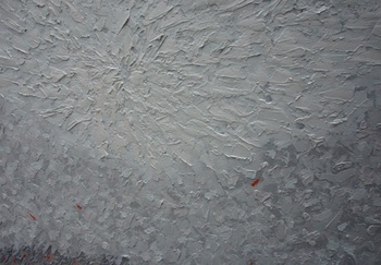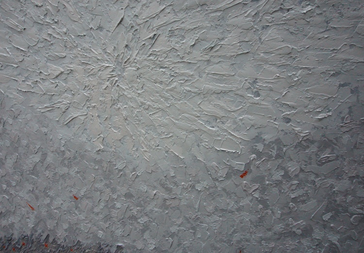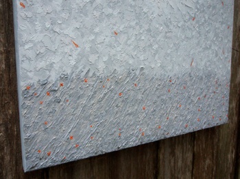 Oil on canvas. Abstract blue grays with spots of orange, very textured.