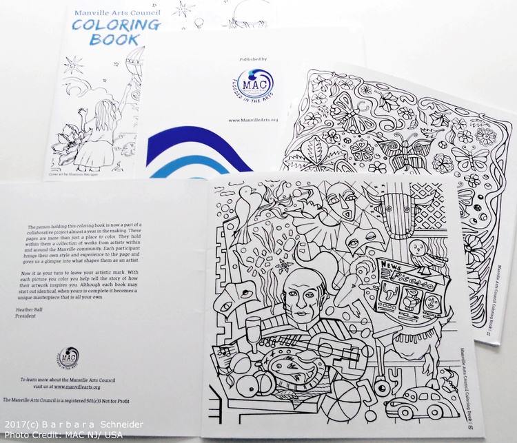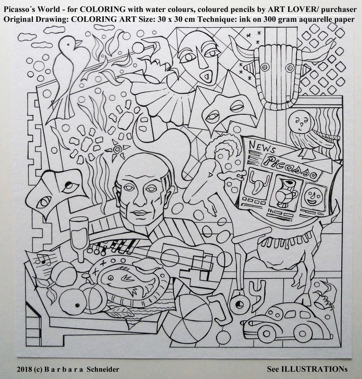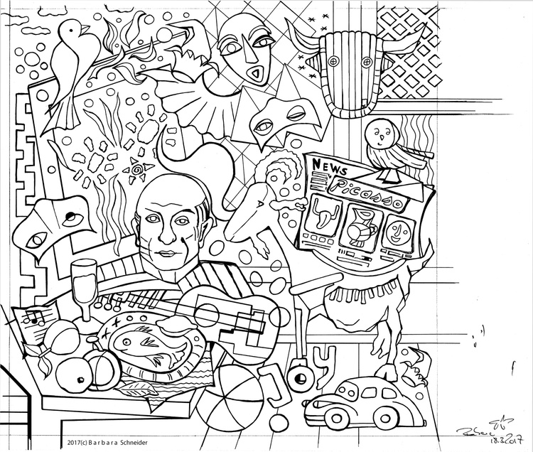 Picasso´s World, Coloring Page, Technique: hand made ink drawing, vectorized image. “Manville Arts Council Coloring Book ” by Manville Arts Council, illustrated by a selection (contest, jury) of artists (NJ/USA, 2017) BOOK LAUNCHED - September 9, 2017: Books will be available at the Manville Public Library, NJ/USA for a donation of $10 and (soon) via MAC website. Project IMAGE: ORIGINAL INK DRAWING, Coloring Book, 20 Illustrations, Page 1 and 11 by B a r b a r a