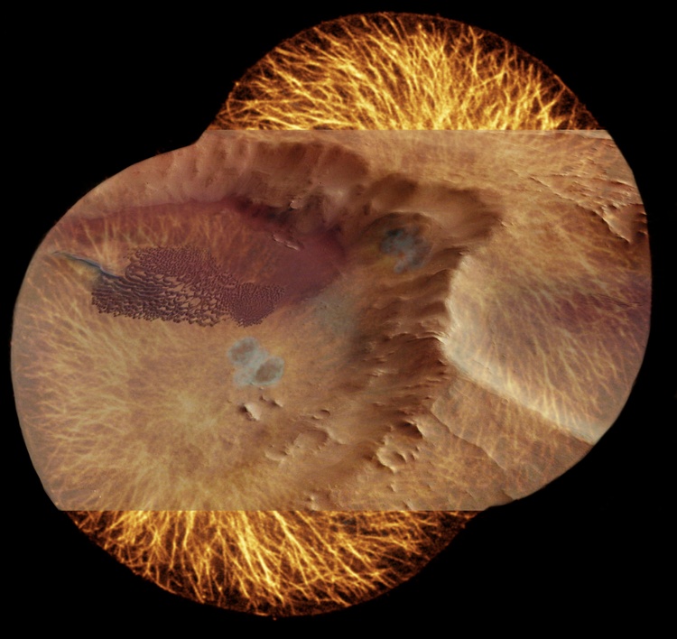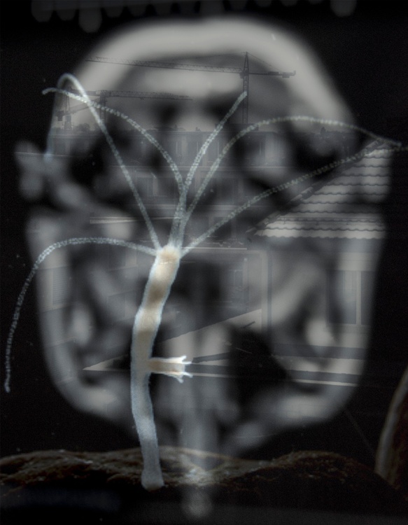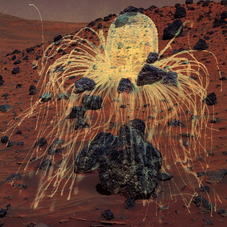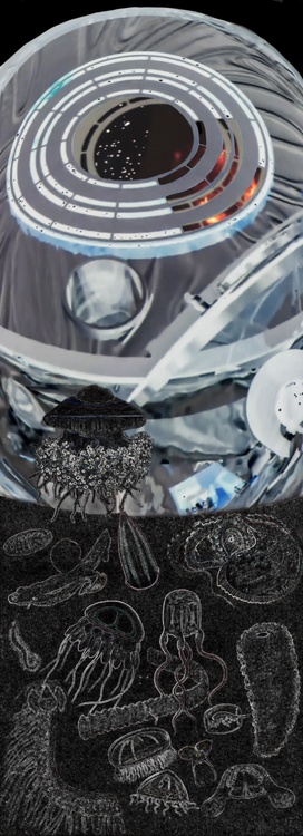 The wish for immortality turns up constantly in human history, from the oldest myths known to all cultures right into today‘s epoch of the Anthropocene. In his search for immortality Gilgamesh must overcome countless obstacles to reach Utnapishtim who had saved his family and many animal species before the flood and had thus received immortality from the gods. He knew about a plant from the deep ocean which promised the defeat of death. Gilgamesh however, wiser by his journey and encounters, renounces immortality and returnes as a fair and wise king to his people. A few years ago Sillicon Valley tech moguls founded an enterprise worths 200 Bn with the purpose to overcome death or at least to extend life (programmed death and radical life extension). They call themselves transhumanists or cyborgs trying to annul natural laws with different technologies. They undertake scientific investigations of immortal plants, animals and micro-organisms, such as the jellyfish urritopsis dohrnii types of Hydras, different bacterial types, lichens and sponges as well as application of Artificial Intelligence to gain immortality. Other measures like genetic manipulation, nanotechnology, nanorobotics, cloning, up to Cryonics (freeze of the body) and mind-to-computer upload or brain implants are tested and implemented on human beings. These endeavors are among others conducive to gaining time for the purpose of colonizing alien planets. For years both governmental institutions and private corporations have been looking for life on mars hoping to provide a new home a to a small elite after the deluge. The pictures are named after personalities and deities of the Gilgamesh epos. This work is a digital assemblage of my own digital, found and collected analog and scientific photographs and sketches.