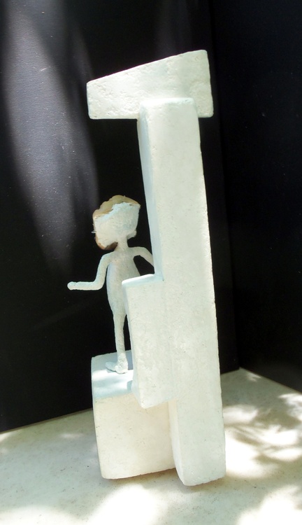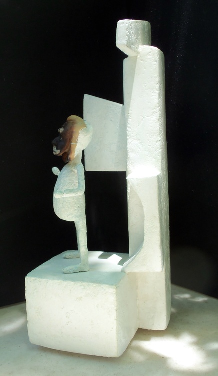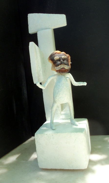 This 3D piece has a bit of a backstory. When my son was quite young, he and I went to a bargain store here in Austin, Texas. It was near Christmas, I think. At any rate we found a small Santa head with requsite hat and faux fur. It was designed to hang on a tree and its placard read, 'Forever Beautiful.' It was a wee bit tacky and my son and I both laughed when we studied it. Of course, I bought it. It was only 99 cents. I think everything in that store was the same price. Anyway, when I bought my mortgage a few years later, i hung it outside on the porch so it could get the benefit of Central Texas weather. Whenever my son visited, he would study it and note its gradual deterioration. The light rosy pink flesh tones darkened and the cap and fake fur gradually fell away. A few years back, I took it down and put what was left of it in the garage. I recently rediscovered it there and thought I'd use it in a piece. This is the outcome. Using my special compound, it is 4.25 inches wide, 5.5 inches deep and 14 inches tall. I left it the color of the compound with a varnish that I tinted green and added to that a glow in the dark additive. Original Jones Art as it decomposes with slight luminescence in that wondrous city some call Austin, Texas.