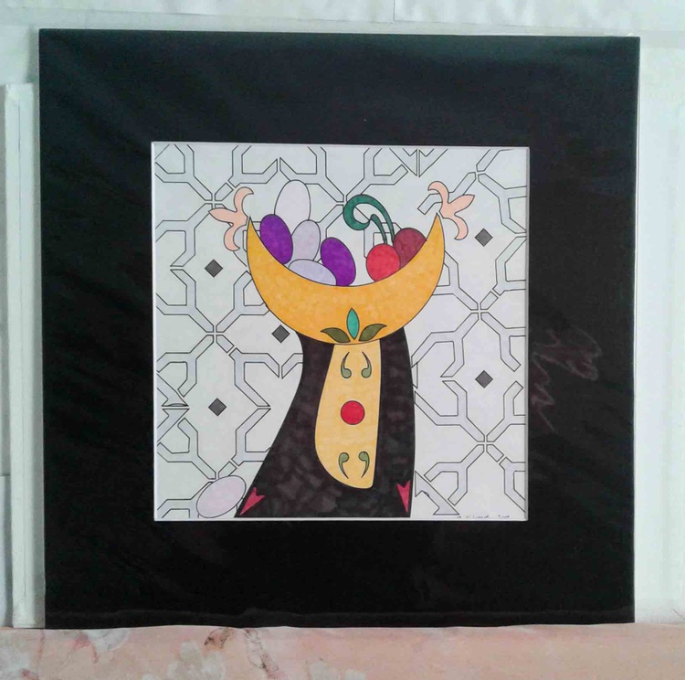 This was my second still life piece. I wanted to experiment with more of a designed, but muted, background that wouldn't detract from the cup. The fruit was imagined and created using basic shapes, where the background was created with a stencil. Mounted, matted and sealed. Measures 12x12