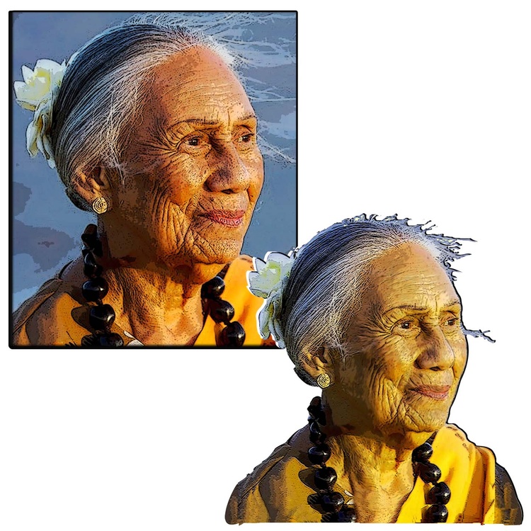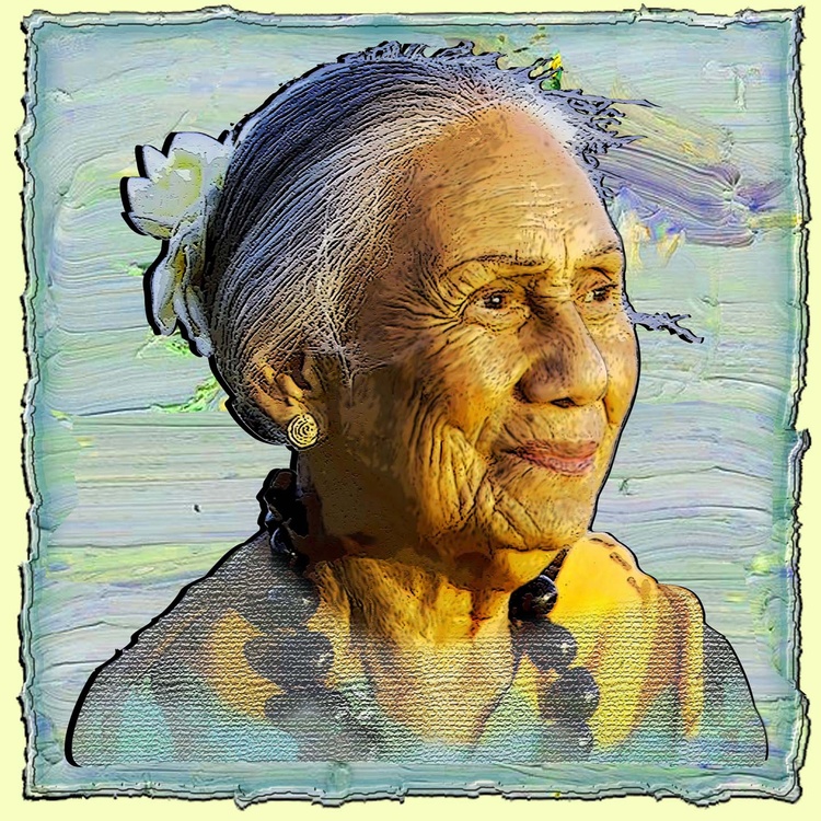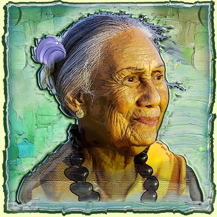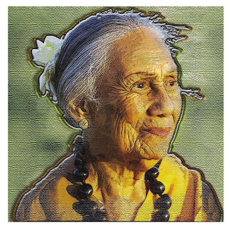 Kauila Reyes recently passed away at 93 & left a deep local legacy as the longest living Kumu hula here on Molokai. I saw a good photograph of her in a local bookstore & downloaded one just like it from the internet, so I could add a little Photoshop magic to match my personal impression of her as a friend & neighbor.