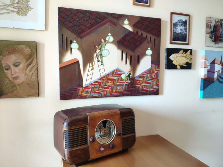 Oil on canvas, 90 x 70 cm, 2020. Every family has its own legends. Those of my family are centered on the figure of my grandfather. My grandfather made his living by inventing a thousand jobs: he was a blacksmith, but also an electrician, carpenter, handyman ... In his small village of origin, before the war, public lighting had not yet arrived. He was asked to build a street lighting system, he did it. As a boy, I often fantasized about helping him in this enterprise, which would have been impossible, because he died before I was born. But I liked to imagine myself carrying these big heavy lamps between the houses and the courtyards, where, in reality, some of those that he built are still working! In case of sale shipping is worldwide free.