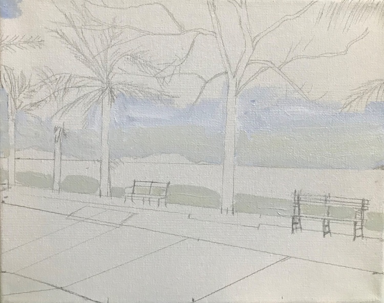 Ft. Amador causeway was created from the dirt taken out of the Panama Canal; it is the causeway to each of the 3 fortified islands. Ft. Amador was one of the many military bases on the Panama Canal Zone. It had a beach, the Army Navy Officers Club & a Golf Club that it allowed U.S. Government Civilian employees be members to. My parents were members of all 3 & we had a sticker on our car that allowed us to be waved through at the guard gate. My 16th birthday party was held at the Amador Army & Navy Officers Club, my parents golfed at the Amador Golf Club almost every weekend & I with friends & as family & alone went to the Amador Beach. I painted this from a photo I took more recently. The causeway had grass & palm trees on either side of the road. Panama changed it up with a pinkish/reddish tile or brick with benches on it & a side walk right next to it on the sides of the road.