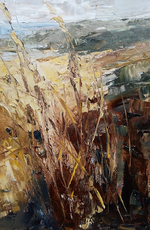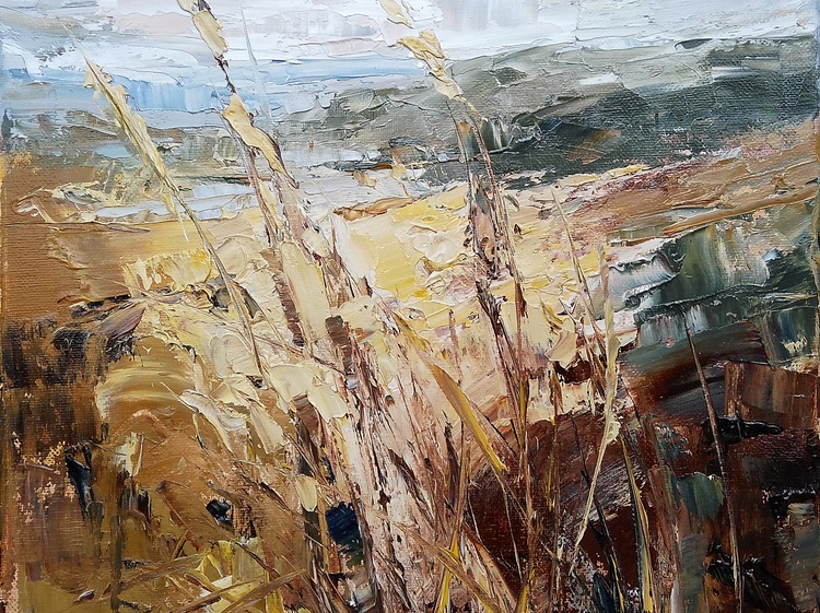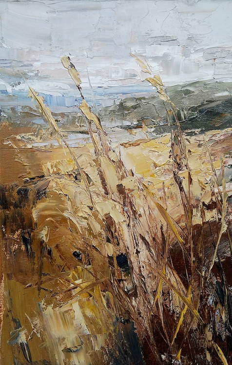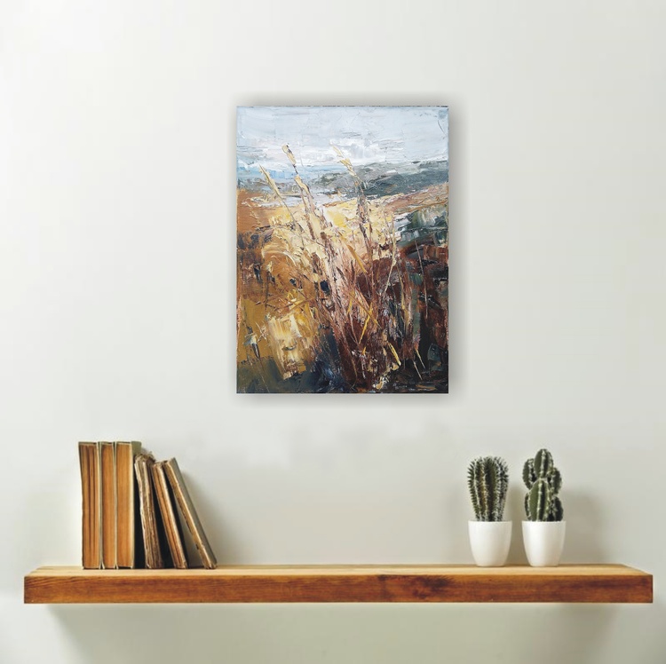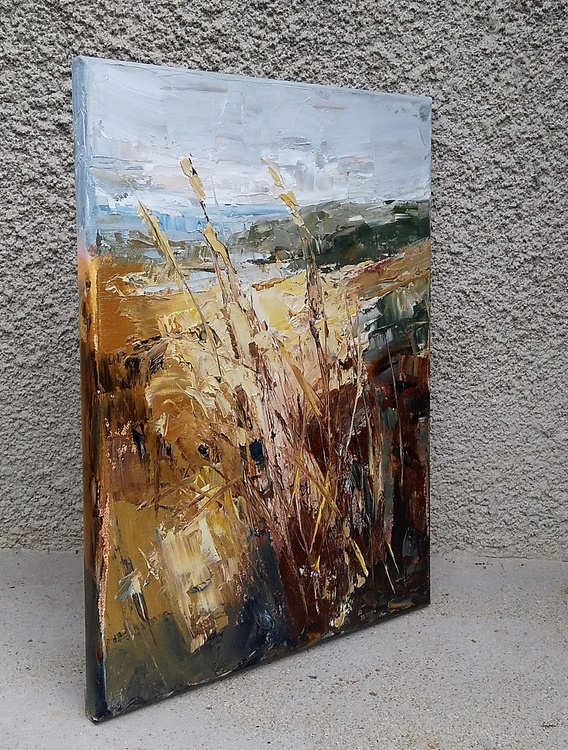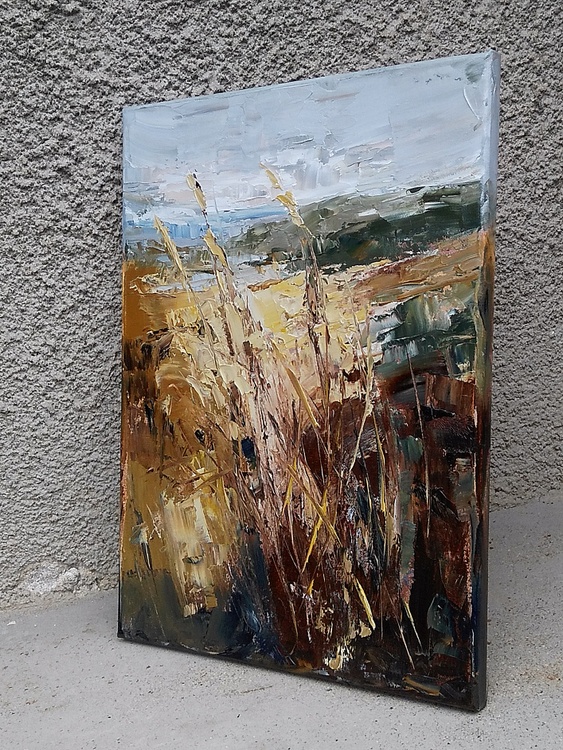 This painting is part of my field series. My freedom-loving personality was always been drawn by the fields. I love the feeling of endless, freedom and reverie that the fields evoke in me. I love painting them. While painting I feel the gentle wind playing all around me, I hear the whispers of the grass, I feel my soul floating towards the horizon… and I am happy. Hope you are too when looking at these paintings. This original oil painting is made on stretched cotton canvas. Size is 30x40cm. Depth 1 cm. Canvas is gallery wrapped and painted on the sides, so the painting could be hang as it is without a frame if preferred. The painting will be sent safely packed within 4 working days after the purchase. A certificate of authenticity will be enclosed.