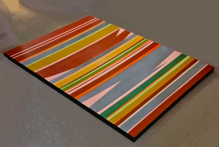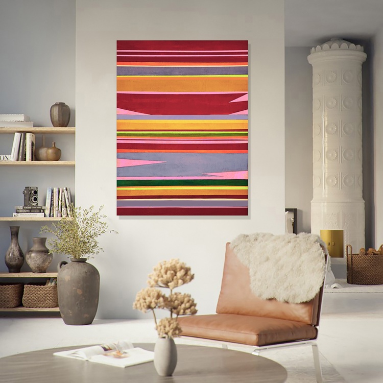 This painting was inspired by the landscape of the high desert in New Mexico. The surface texture is much like a handmade woven blanket, with many brush strokes going in different directions. This is an abstract acrylic painting on canvas. The sides are finished with black tape to make it suitable for hanging, though you may wish to have more permanent framing. It is wired for hanging. Please note: the most accurate coloration is on the side view of the work.