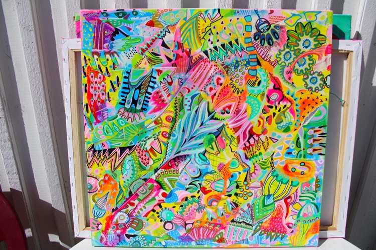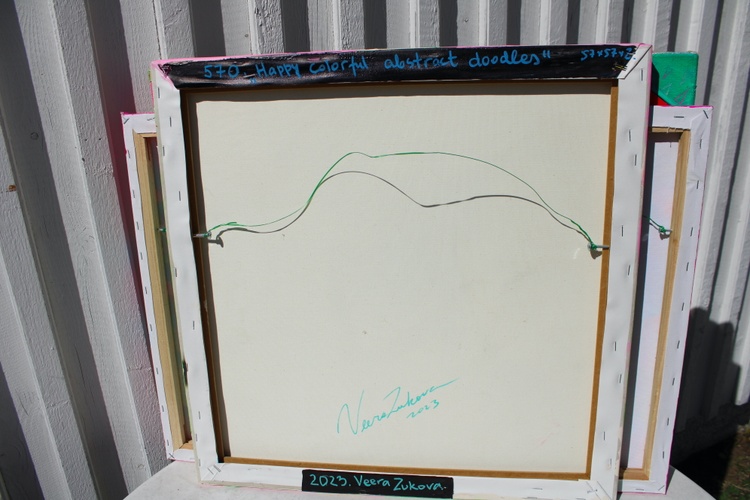 "Happy Colorful Abstract Doodles" is a vibrant and dynamic painting on canvas, created in 2023. This artwork, measuring 57 cm by 57 cm, is designed to captivate art collectors who appreciate the exuberant and whimsical nature of contemporary abstract art.