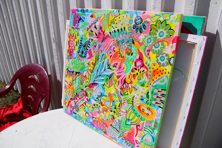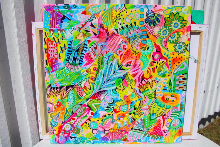 The use of acrylic, gouache, watercolor, and spray paint allows for rich, saturated colors and a smooth, vibrant finish. The artist’s skillful application of paint brings out the luminosity and depth of the colors, creating a textured surface that engages both the eyes and the hands. The detailed patterns and forms invite viewers to explore the painting repeatedly, discovering new details with each viewing.