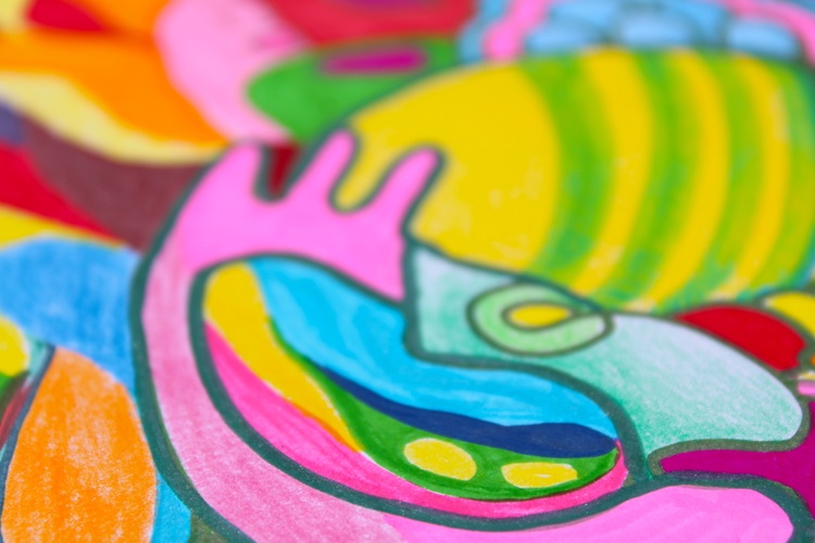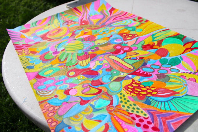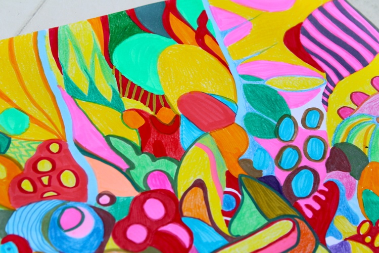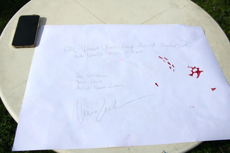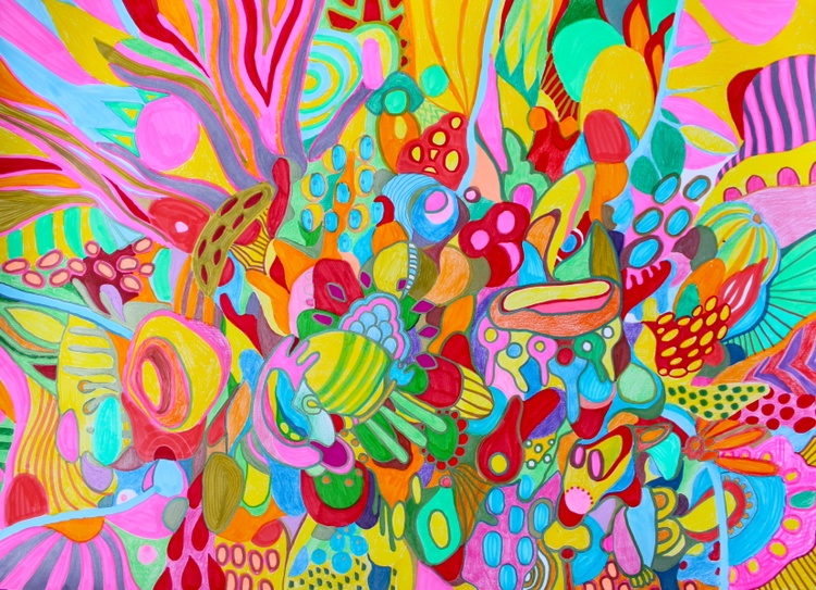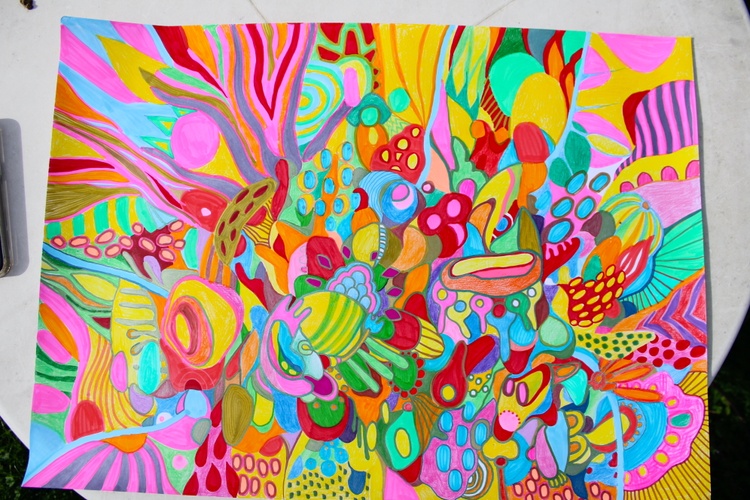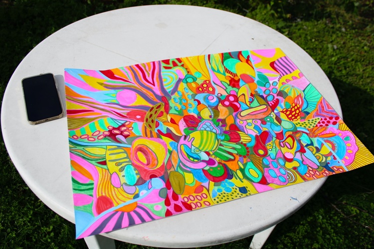 Discover the vibrant energy of Vibrant Chaos, an abstract masterpiece by artist Veera Zukova. This large-scale work combines bold marker strokes and colorful pencil accents on thick paper, creating a whirlwind of expressive organic shapes and intricate patterns. The dynamic composition features a kaleidoscope of bright pinks, yellows, blues, and reds, blending elements of abstract expressionism and psychedelic art.