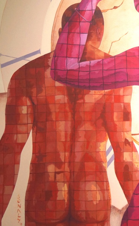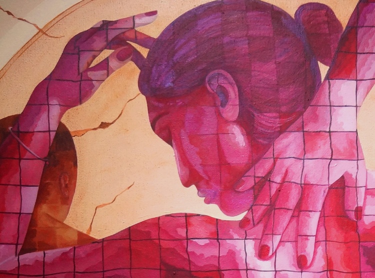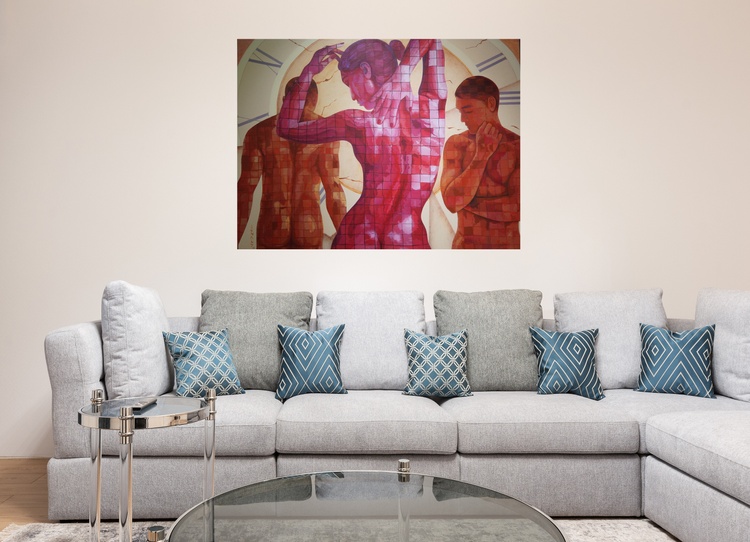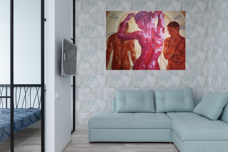 Art has always been a powerful medium to convey emotions and provoke thoughts. In my painting, titled “Changing Times,” I aim to encapsulate the complexity and fragility of relationships amidst the inevitable passage of time. This canvas tells a story through imagery, with a beautiful lady positioned in the center, flanked by two men. However, it is the presence of a shattering clock in the background that truly captures the essence of how time influences and alters the dynamics of relationships. At the heart of my painting lies a captivating lady, an embodiment of beauty and grace. Placed intentionally in the center, she acts as the focal point, commanding attention and eliciting intrigue. To her right stands a man, his gaze fixated upon her. His body language displays a longing, a yearning for a connection with the lady. They share a moment frozen in time, encapsulating the intensity of a blossoming relationship. On her left, however, stands another man who portrays a contrasting stance. He is turned away, walking in the opposite direction. His posture speaks about the transitory nature of relationships. He represents the inevitability of people drifting apart as time passes. His departure hints at the complexities of human connections and how they are not always meant to endure. This intricate addition serves I use the shattering clock in the background as a metaphor for the transformative impact of time on relationships. As the hands of the clock move inexorably forward, relationships go through a series of evolutions, sometimes fracturing and reassembling in unexpected ways. The shattering of the clock signifies the moments when relationships undergo upheaval and change, often driven by the passage of time. It represents how once-solid connections can disintegrate, leaving behind remnants of what once was. Time, as the central theme of “Changing Times,” emphasizes its perpetual influence on human connections. It serves as a reminder that relationships are not static entities but ever-evolving organisms. Each tick of the clock carries within it the potential for growth, decay, and transformation. Time has the ability to bind people together, creating cherished memories and deepening emotional bonds. Simultaneously, it can unravel long-standing connections and expose the vulnerable nature of relationships. The painting seeks to evoke contemplation on the delicate balance between devotion and detachment, as influenced by the passage of time. “Changing Times” is a profound exploration of the intricate dynamics that define relationships. Through the juxtaposition of a captivating lady, two conflicted admirers, and the shattering clock, this painting presents a visual representation of the complex interplay between time and human connections. It serves as a poignant reminder that relationships are ever-changing, echoing the perpetual flux of time itself. Through my painting, I invite viewers to reflect on their own relationships and the profound impact of time on their lives and to cherish the present, navigate the challenges of the present moment, and embrace the uncertainty of what lies ahead. I use vibrant hues of pink, orange, ochre and sienna to bring out the best in the composition. To symbolize the pursuit of perfection within the modern human race, I use my signature style of symmetrical forms like squares, rectangles, checks, and butterflies to cover the human figures in my paintings. These geometric shapes represent the desire for flawlessness and balance, encapsulating the aspirations and struggles we all face as individuals striving for fulfillment.