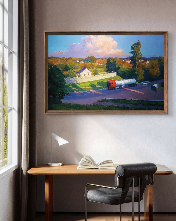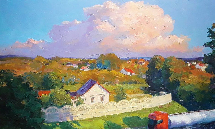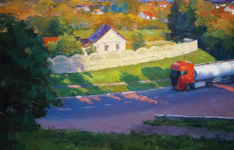 The painting titled "Evening City" depicts a peaceful and picturesque suburban landscape as evening approaches, capturing the warmth and tranquility of a small town. The scene is bathed in the soft, golden light of the setting sun, casting long shadows across the road and illuminating the houses and greenery with a warm glow. The artist masterfully uses light and color to create a sense of calm and harmony, highlighting the beauty of everyday life in a quiet community.In the foreground, a large red truck with a white tank trailer is parked on the road, suggesting a brief pause in its journey. The truck is painted with bold colors, standing out against the softer tones of the surrounding landscape. Its presence adds a dynamic, modern element to the scene, representing the connection between rural life and modern infrastructure.To the left of the truck, a charming white house with a red roof is nestled behind a decorative fence. The house appears well-kept and inviting, symbolizing the warmth and comfort of home. The shadows cast by the fence and trees create a sense of depth and movement, enhancing the realism of the painting.In the background, lush greenery and scattered houses stretch out toward the horizon, giving the impression of a peaceful, close-knit community. The artist paints the trees and bushes with a variety of green tones, adding richness and texture to the landscape. The distant houses are painted in soft reds, whites, and blues, blending harmoniously with the natural surroundings.Above the scene, a large, fluffy cloud dominates the sky, painted in shades of cream, pink, and light orange. The cloud reflects the warm light of the setting sun, creating a dramatic and captivating sky that contrasts with the calmness of the landscape below. The sky’s vibrant colors evoke a sense of serenity and beauty, reminding viewers of the peacefulness that comes with the end of the day.Through "Evening City," the artist aims to convey a message about the quiet beauty of everyday life and the connection between nature, community, and modern progress. The painting captures a moment of stillness and reflection, inviting viewers to appreciate the simple pleasures of rural living. The presence of the truck on the road suggests movement and transition, symbolizing the constant flow of life and the journeys we all take.The artist’s use of light and shadow, combined with vibrant colors and expressive brushstrokes, creates a sense of warmth and comfort. "Evening City" celebrates the balance between tradition and modernity, encouraging viewers to pause and reflect on the beauty of their surroundings. The painting evokes feelings of peace, nostalgia, and a deep appreciation for the quiet moments that make life meaningful. 1126