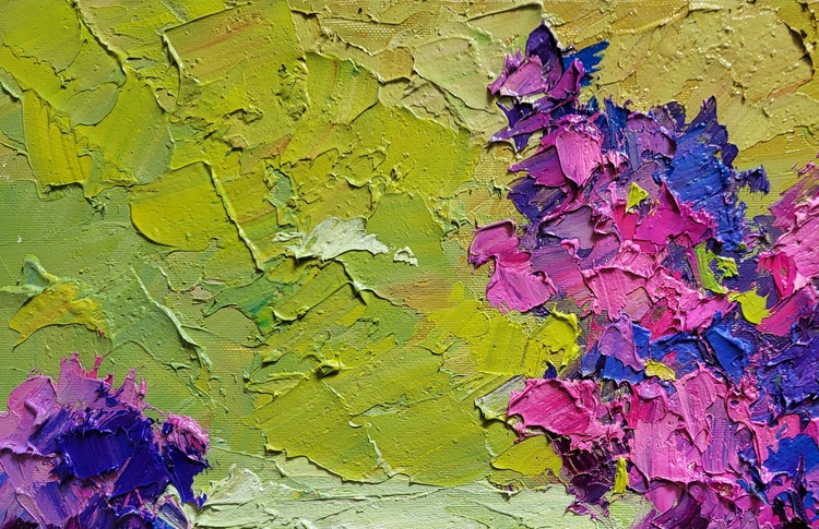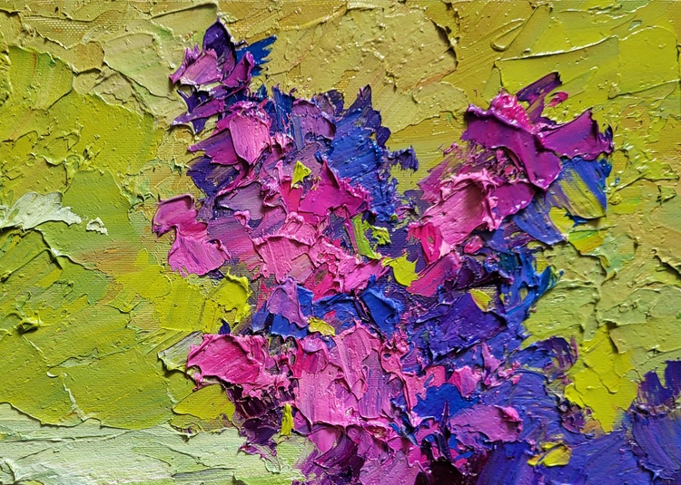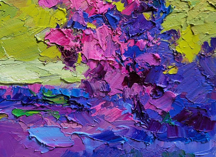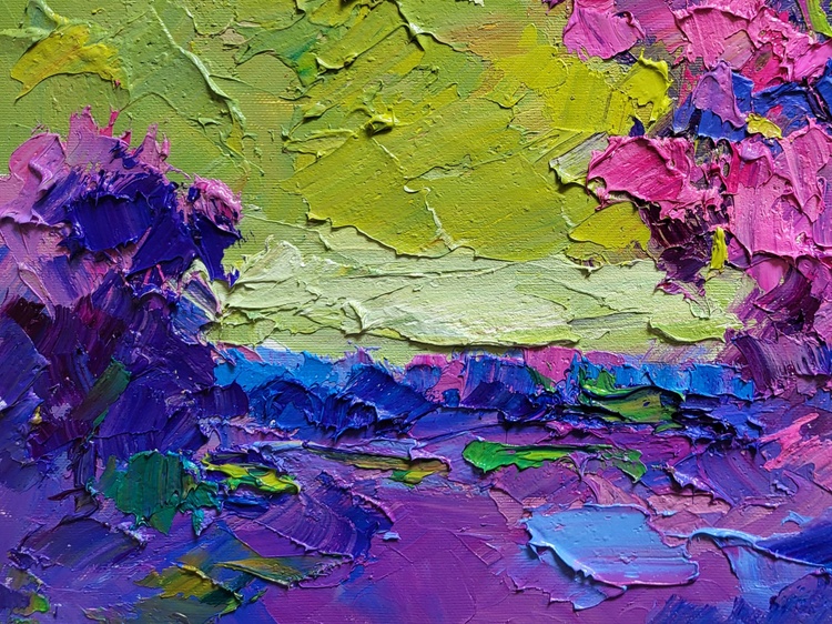 Boris Serdyuk's painting "Summer Evening" is a vibrant and expressive portrayal of nature's twilight hues. The composition bursts with an array of bold, textured strokes in vivid greens, purples, and pinks, capturing the essence of a serene yet dynamic evening in summer. The artist uses thick layers of paint to create a tactile quality, evoking the lushness of foliage and the soft, fading light of dusk. The juxtaposition of warm and cool tones conveys the harmonious transition between day and night, imbuing the scene with an emotional resonance. Serdyuk's approach invites the viewer to feel the peaceful embrace of a summer evening, where the colors of the natural world seem to dance and transform, leaving an impression of fleeting beauty and tranquility. 1068