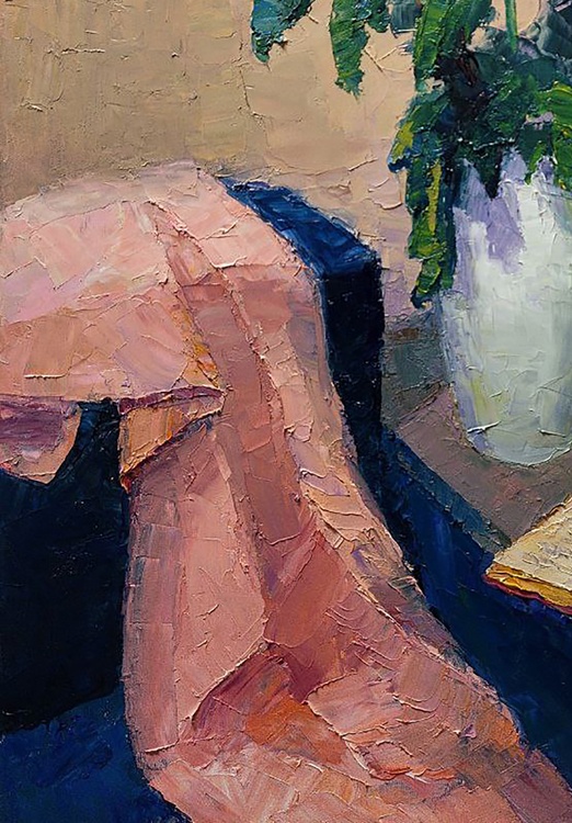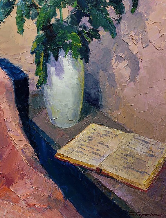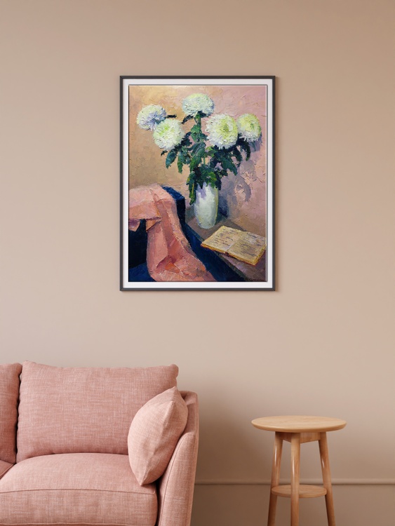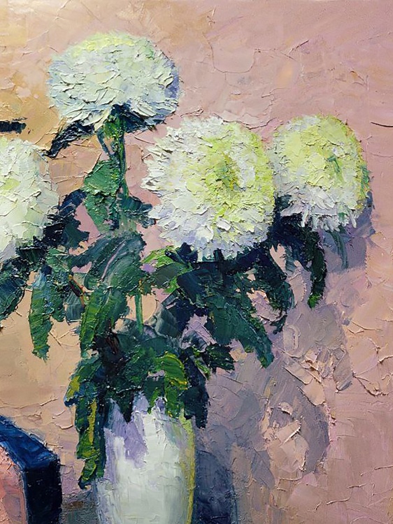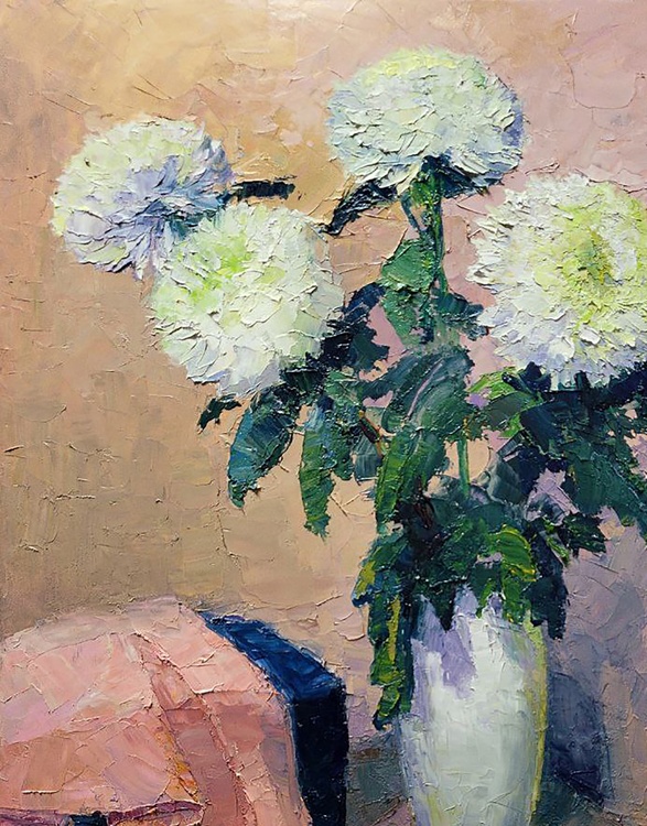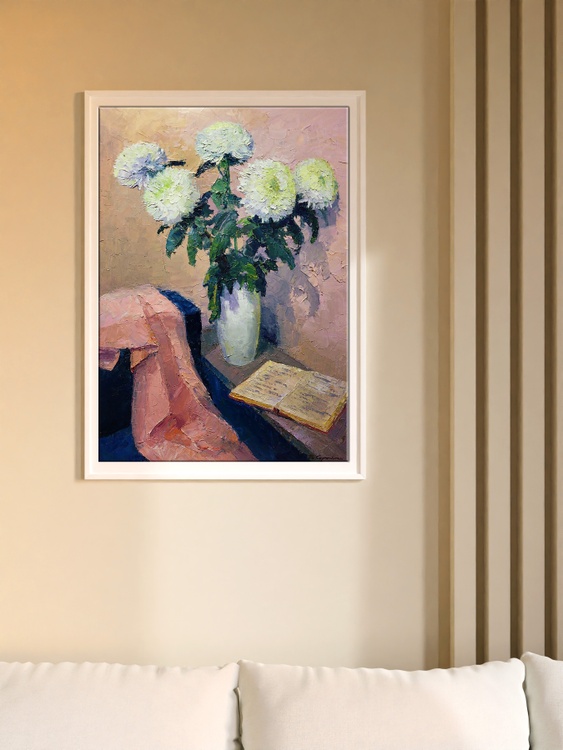 The oil painting titled "White Chrysanthemums" is an exquisite still life that exudes a sense of quiet elegance and contemplation. The artwork features a bouquet of white chrysanthemums, full and lush, with each petal meticulously rendered in varying shades of white and hints of blue, giving a lifelike quality to the flowers. The blossoms are set in a simple, rounded vase that reflects the light, adding a subtle sense of depth and realism to the composition. The background is painted in warm, muted tones of beige and tan, providing a soft contrast that allows the white blooms to stand out. The texture of the background is rich and appears almost tactile, with the crackling effect of the paint adding an antique charm to the piece. In the foreground, a draped cloth with folds catching shadows and light adds a sense of movement and softness to the composition. The cloth is rendered in delicate pinks and deep blues, its folds creating a dynamic interplay of color and form. Beside the vase, an open book lies on the surface, its pages aglow with warm yellow tones that suggest the passage of knowledge or the quiet pleasure of reading. The presence of the book adds a layer of intellectual or reflective depth to the painting, inviting viewers to ponder the relationship between the beauty of nature and the human pursuit of thought and art. The artist's use of impasto technique brings a three-dimensional quality to the chrysanthemums, as the thick application of paint catches the light and casts tiny shadows, making the flowers almost jump off the canvas. The title "White Chrysanthemums" not only describes the subject matter but also evokes the traditional symbolism of these flowers, which can represent truth and purity. The artist's signature is discreetly placed, ensuring that the composition speaks for itself, while still acknowledging the creator's hand in this tranquil and beautiful scene. 1039