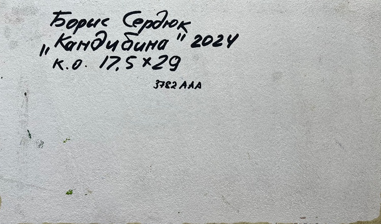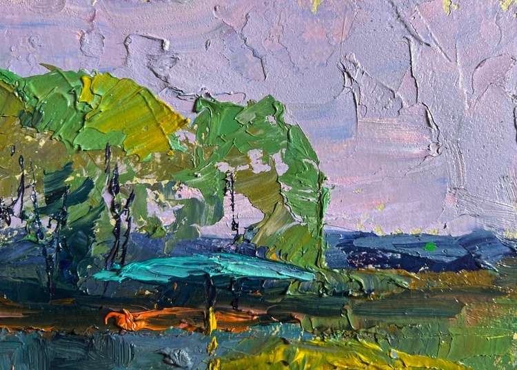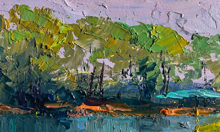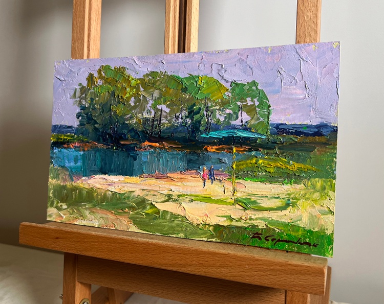 This oil painting cardboard, titled "On the golden shore", the composition is thoughtfully arranged to draw the viewer’s eye across the landscape, from the foreground to the distant trees and water. The foreground is dominated by a sandy shoreline, rendered in warm golden and earthy tones, giving a sense of softness and warmth under the sun. A pair of small figures walks leisurely along the shore, adding a human element to the otherwise natural setting. To the right, a tall, thin post or pole stands near a small, shaded structure, possibly a beach umbrella or a wooden canopy, providing a focal point of interest. The middle ground is occupied by a calm body of water, painted in deep blues and reflective greens, mirroring the sky and surrounding foliage. The background features a dense tree line, rich with shades of green, punctuated by touches of orange and warm hues, suggesting sunlight filtering through the leaves. The sky, depicted in soft lavender and gray tones, adds a dreamy and atmospheric quality to the painting, enhancing the feeling of serenity and relaxation. The composition flows smoothly, leading the viewer through different textures, colors, and focal points, evoking the gentle movement of water and air. The small human figures, dressed in hints of pink and blue, add a delicate pop of color, drawing attention to the leisurely pace of life along the shore The play of light and shadow is skillfully executed, emphasizing depth and natural contrast, making the scene feel both inviting and expansive. The water is rendered with blended and layered strokes, reflecting the gentle ripples and mirrored sky. The sand is painted with thick, sweeping strokes, giving it a tangible texture that mimics the uneven softness of the shoreline. The trees and foliage are depicted with energetic, multi-directional strokes, adding depth and volume to the dense greenery. The sky is painted with smooth, blended strokes, contrasting with the textured land and water, creating a soft atmospheric effect. This expressive technique brings the painting to life, making it both visually and texturally engaging. The artist’s signature appears subtly in the lower right corner, blending naturally with the earthy tones of the foreground. The painting follows an impressionistic style, focusing on color, light, and movement rather than intricate details. The dynamic brushwork, well-balanced color contrasts, and expressive textures make this painting a striking and immersive landscape. 3782