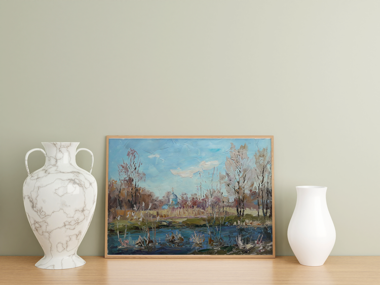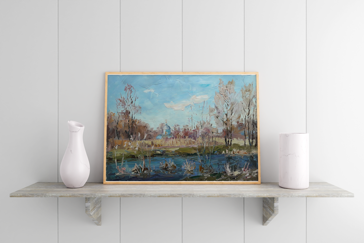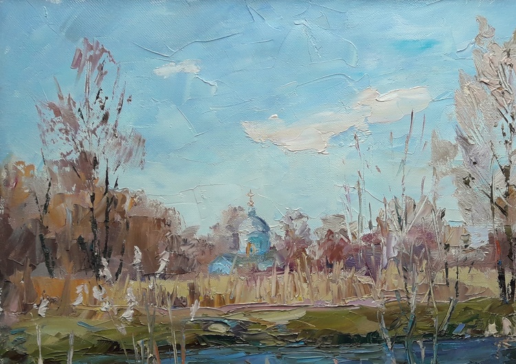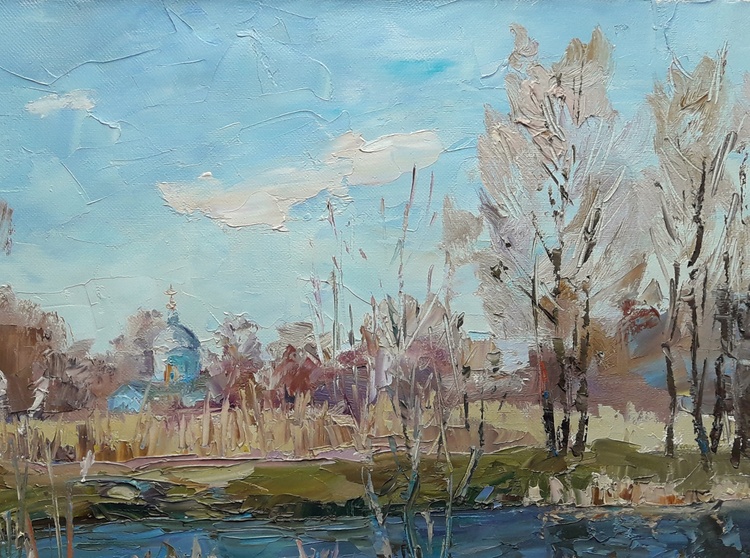 "River Yezuch" by Boris Serdyuk captures the calm beauty of a riverscape, immersing the viewer in a tranquil moment of nature. The painting portrays the serene waters of the Yezuch river reflecting the surrounding reeds and bare trees, hinting at the arrival of early spring or the final moments of autumn. In the background, a small church with a domed roof appears among the trees, adding a subtle spiritual element to the scene.Through light, earthy tones and expressive brushstrokes, Serdyuk conveys a sense of stillness and reflection. The church symbolizes harmony between nature and faith, suggesting that beauty lies not only in grand landscapes but also in these quiet, almost forgotten places. The painting evokes peace, nostalgia, and the fleeting nature of seasons. 132