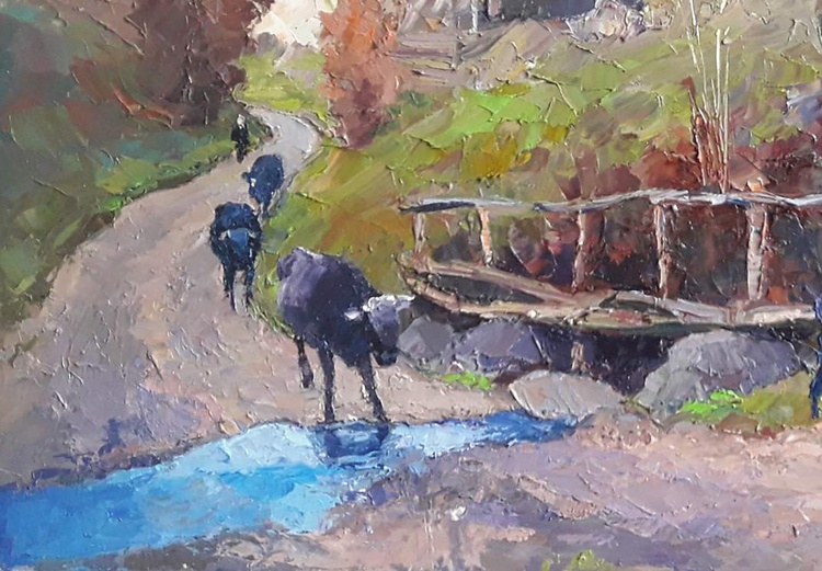 Take a walk down this country road with us and see the cows returning home from the pasture. This oil painting is simply titled "Return." It captures the idyllic scene of a bygone era, when life moved at a slower pace and people had a closer connection to nature. This painting is more than just a pretty picture, it's a window into another time and place. When you look at it, you can't help but feel a sense of nostalgia for a simpler way of life. Whether you're looking to add some country charm to your home or simply want to escape to the countryside for a moment, "Return" is the perfect piece for you. 508