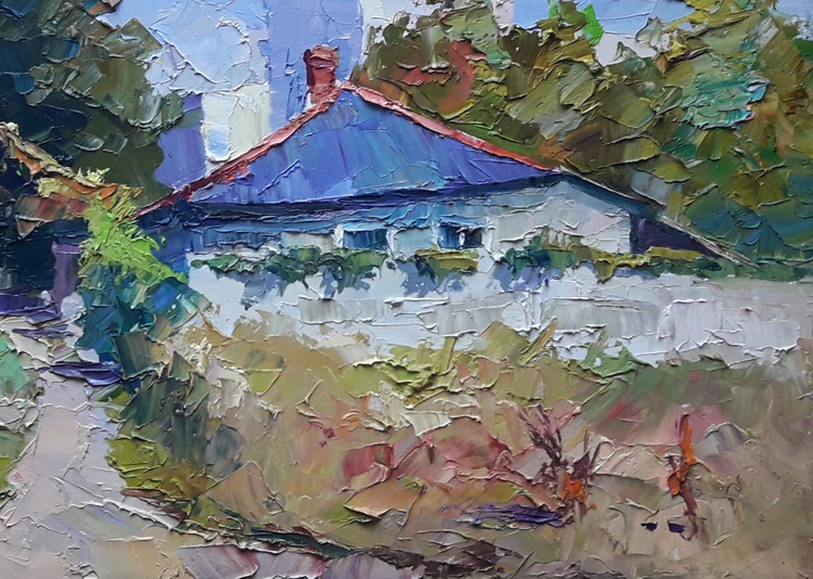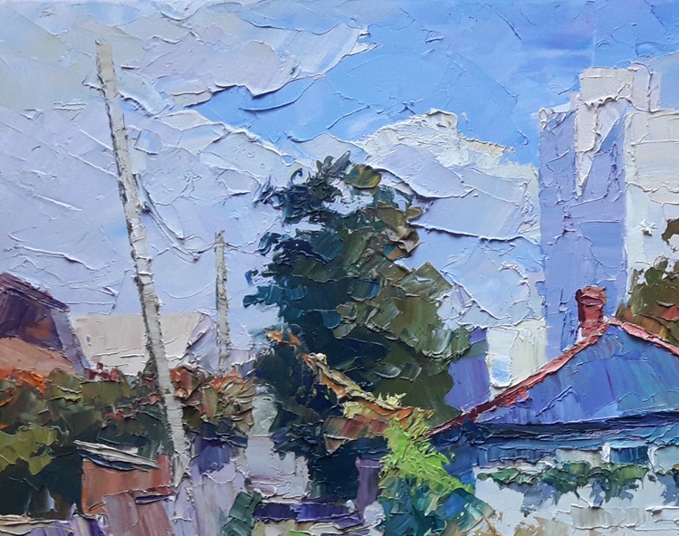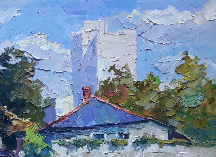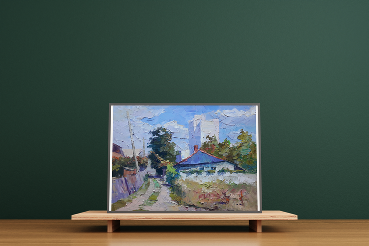 This oil painting is a beautiful work of art. It features a view of the outskirts of a city, with country houses and gardens in the foreground, and tall city houses in the distance. The date on the painting is August, which makes it a perfect choice for anyone who loves the summer months. This painting would make a great addition to any home or office, and would be a wonderful gift for anyone who loves art. 529