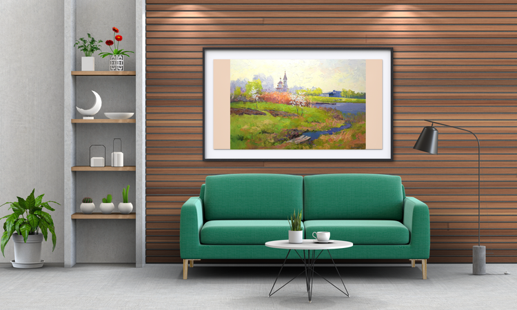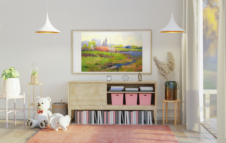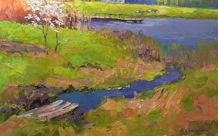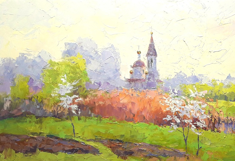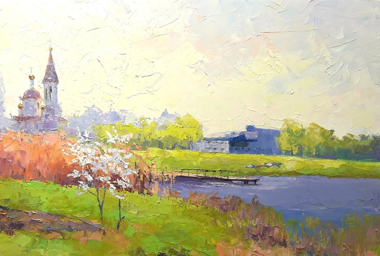 This wonderful oil painting called "Spring in Poltava region" is a must-have for anyone who loves nature and wants to bring a little bit of the outdoors inside their home. The painting depicts the scenic Poltava region in all its glory, with green meadows, a small river, and flowering trees. The church in the distance adds a touch of history and religion to the scene. The colors are simply beautiful, and the overall effect is peaceful and serene. This painting would make a perfect addition to any room in your home, and it would be sure to elicit compliments from all your guests. So don't hesitate – order your own "Spring in Poltava region" oil painting today! 629