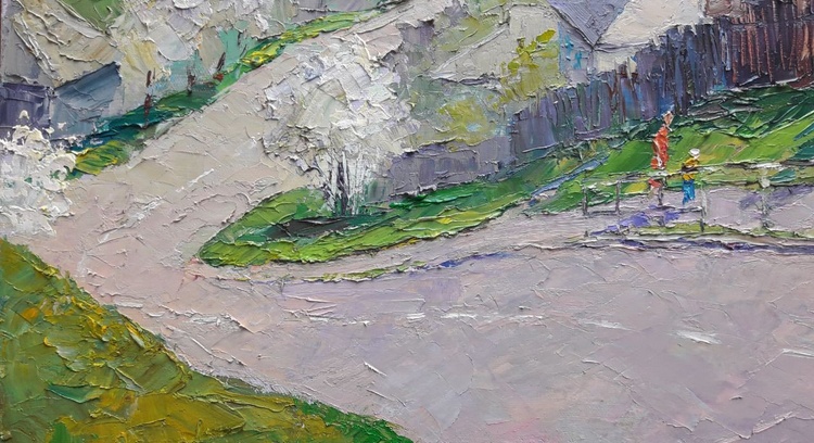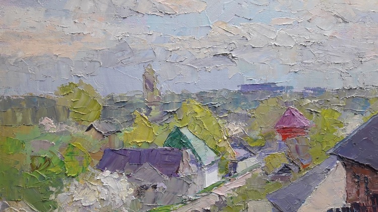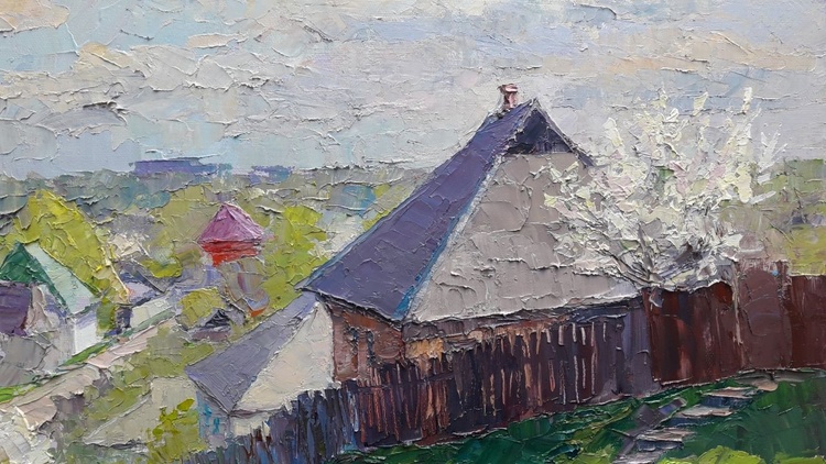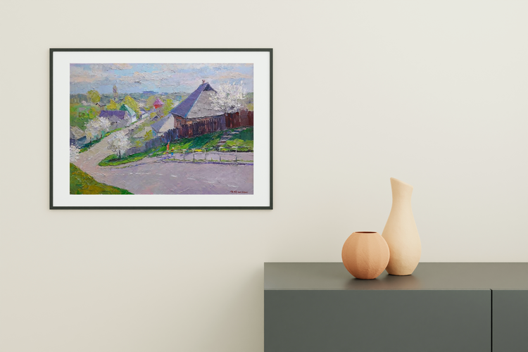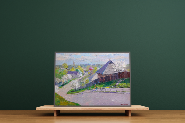 Looking at this oil painting, you can almost smell the fragrance of the blooming flowers and feel the warm sun on your skin. The scene is of a village view from a hill, with colorful gardens in full bloom. Green trees line the streets, and a bright blue sky completes the picture. It's easy to imagine strolling through this idyllic scene on a beautiful spring day. The artist has used bold brushstrokes to create a sense of movement and energy, while still maintaining a soft, ethereal quality. The colors are vibrant and alive, creating an overall feeling of joy and happiness. This painting is sure to brighten any room and bring a touch of springtime beauty into your home. 746