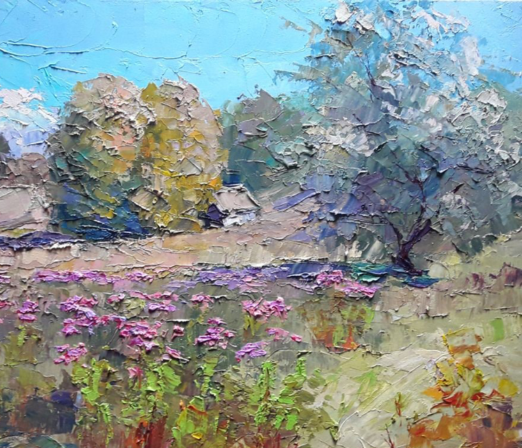 "Autumn Flowers" by Serdyuk Boris captures a peaceful rural landscape bathed in the warm, golden light of autumn. The painting employs thick, textured strokes, adding a tactile quality that brings the scene to life. A field of vibrant, purplish flowers in the foreground leads the viewer's eye to quaint cottages nestled among colorful autumn trees. The sky, a bright blue, contrasts with the earthy tones of the foliage, enhancing the painting's sense of depth and serenity. Through this piece, Serdyuk Boris conveys a celebration of nature's beauty in its transitional season, capturing a moment of stillness and harmony. 788