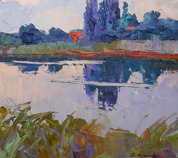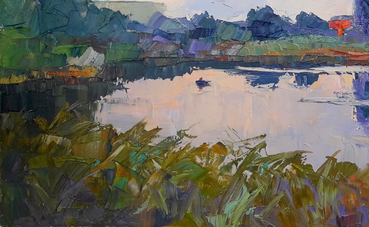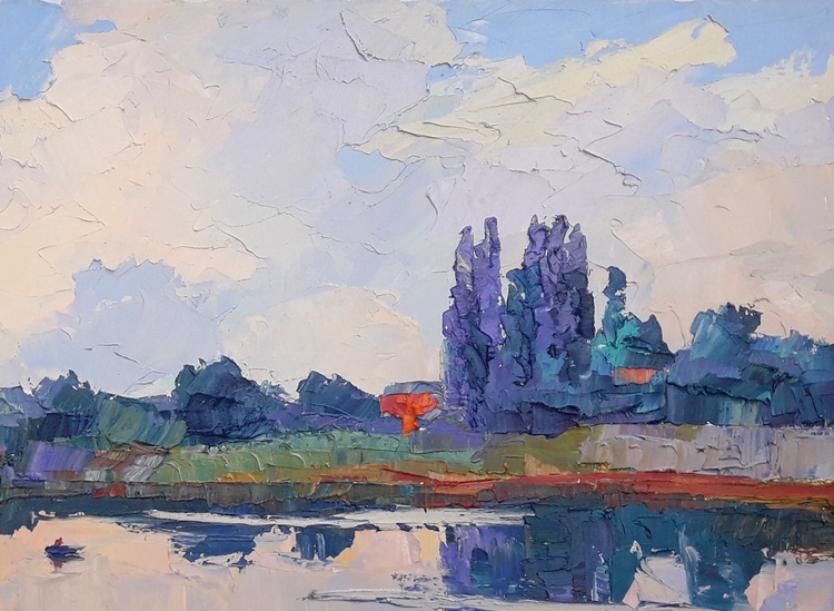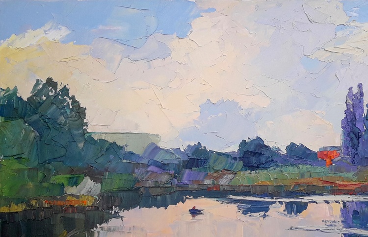 "River Bed" by Serdyuk Boris captures a serene riverscape under a vast sky. The painting is rendered with textured brushstrokes, creating depth in the greenery along the riverbanks and reflections in the water. A single boat, gently floating, adds a focal point that draws the viewer into the calm ambiance of the scene. The use of cool colors, interspersed with hints of warm tones, evokes a peaceful, reflective atmosphere. Through this work, the artist expresses a deep appreciation for the tranquility of nature and the quiet beauty of a riverbed, encouraging the viewer to pause and find solace in the simplicity of the landscape. 800