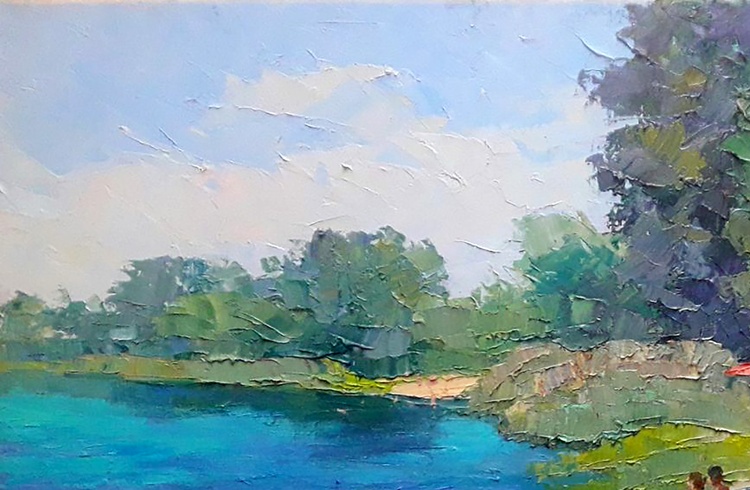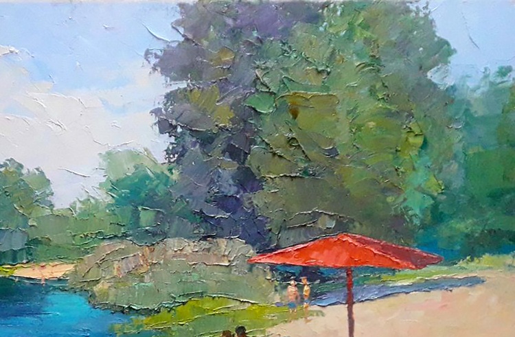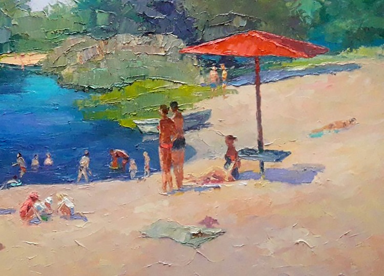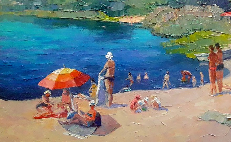 "Hot Day" by Serdyuk Boris captures the essence of a warm, sunlit day by the water. The artist uses vibrant colors and textured brushstrokes to convey the heat and relaxation of a summer scene. People are gathered on the beach under umbrellas, enjoying the water and shade, while children play near the shoreline. The blue of the water contrasts with the bright reds and oranges of umbrellas, emphasizing the refreshing allure of the lake. Through this painting, Boris expresses the joy and tranquility of a summer day, evoking a sense of warmth, leisure, and connection with nature. 802