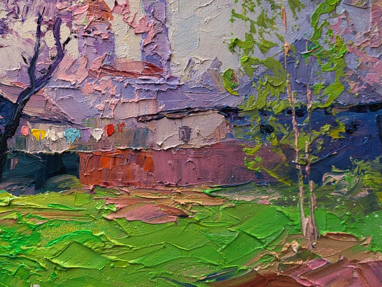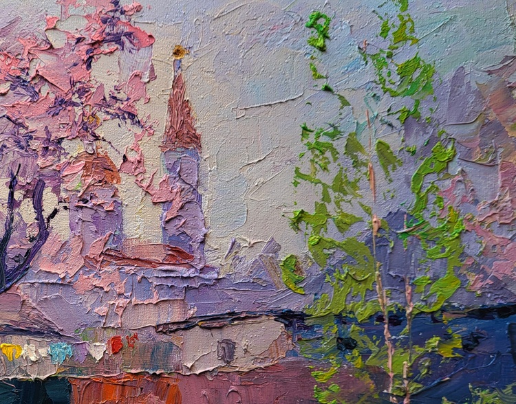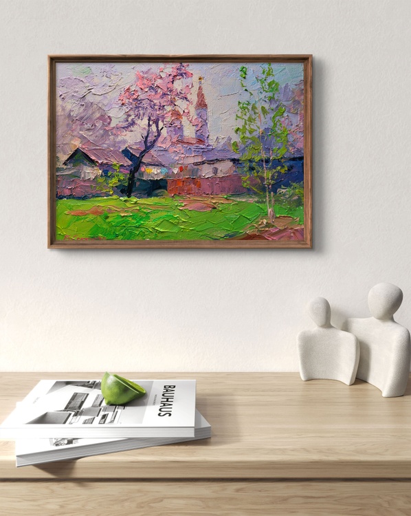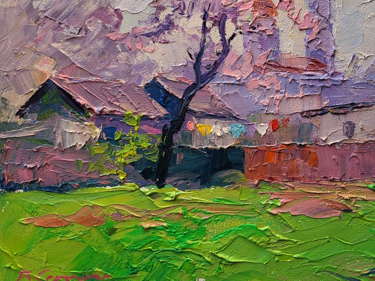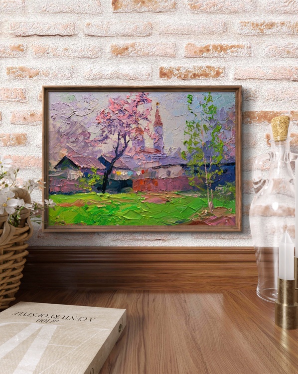 The oil painting on canvas titled "Spring Has Come" radiates the fresh, vibrant essence of a village awakening to the warmth and light of a new season. Rendered with a rich impasto technique, the textured surface brings a tactile quality to the scenery, making every brushstroke feel alive with motion and energy. This work captures that fleeting, magical moment when spring fully arrives — when nature blooms in celebration and even the quietest corners seem to sing with color. At the center of the composition stands a delicate tree adorned with pale pink and lavender blossoms. Its branches, thin and expressive, stretch outward as if greeting the clear sky above. The blossoms are painted with thick, swirling strokes that seem to dance on the canvas, embodying the joy of early spring. Behind the tree, the silhouette of a church rises with soft, rounded forms and gentle verticals. The twin spires, painted in shades of rose and peach, anchor the background and give a sense of quiet dignity and time-honored tradition. Their presence evokes a peaceful coexistence between the divine and the natural world. In the foreground, a row of rustic houses with weathered roofs sits low against the horizon. Their walls are rendered in gentle mauves, violets, and earthy reds, blending seamlessly with the soft pastels of the sky and surrounding trees. The rooftops, layered with palette knife strokes, catch the subtle light of a spring morning, while below them, a string of colorful laundry hangs on a line. These small but vibrant details — flashes of red, blue, yellow, and white — add life and human presence to the scene, suggesting domestic warmth and the daily rhythm of life returning after winter’s stillness. The grass in the foreground is a luminous green, rich with texture and dotted with bold touches of bright lime, ochre, and soft pink. These patches of color do not follow precise contours but rather melt into each other in a poetic, impressionistic style. The ground feels alive, animated by the joy of renewal, and the brushstrokes themselves echo this vitality. A young sapling on the right side, painted in crisp greens and light peach, stands as a symbol of growth and hope, adding balance and vertical movement to the composition. 1164