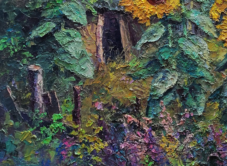 The oil painting on canvas titled "Sunflowers in the Garden" radiates warmth, abundance, and the simple beauty of rural life through its expressive use of impasto technique and rich, earthy colors. Dominating the composition are tall, vibrant sunflowers, their golden-yellow petals bursting outward like small suns, each one anchored by a deep, textured center in shades of burnt umber and crimson. The artist's technique, using thick strokes and visible layers of paint, gives the flowers a sculptural quality, as though they are growing right out of the canvas, swaying gently in the summer breeze. Surrounding the sunflowers are dense, lush green leaves rendered in a variety of hues—from cool emeralds to warm olive tones—creating a vibrant interplay of light and shadow. These leaves are not just background elements but full of life and volume, adding depth to the composition and emphasizing the vitality of the garden. The foliage appears to rustle with the suggestion of motion, as if the viewer has just stepped into this scene at a quiet moment between wind gusts. In the background, a rustic wooden shed peeks out from behind the towering flowers, its aged roof and dark doorway partially hidden by the overgrown plants. The structure is painted with subdued browns, purples, and gray-blues, adding an element of nostalgia and timelessness to the scene. It evokes the presence of human life—someone who once tended this garden, who may still live nearby, quietly enjoying the rhythms of nature. The old shed is neither prominent nor ignored; it becomes part of the landscape, seamlessly merging with the natural world around it. Beyond the garden, a haze of violet and blue suggests distant trees and hills cloaked in mist or softened by the humidity of a late summer afternoon. This atmospheric background contrasts beautifully with the sharp, sunlit foreground, pulling the viewer into a layered experience that shifts from the intimate to the expansive. There’s a balance in the composition between clarity and mystery, between the grounded presence of the sunflowers and the dreamlike aura of the distance. Below the sunflowers, the lower half of the canvas blooms with untamed color—wildflowers, grasses, and patches of purple, pink, and lime green appear in irregular clusters, adding to the impression of a living, breathing garden that is both cultivated and free. 1175
