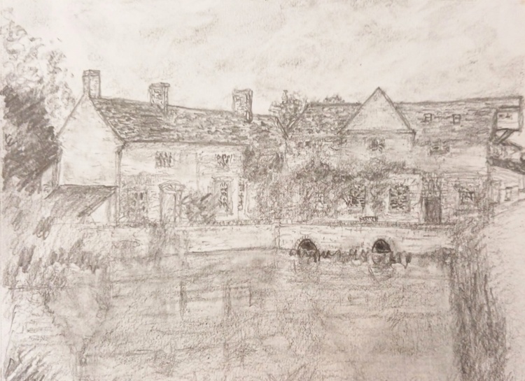 'Flatford Mill' Oil on paper, 41 x 30cm. England National Heritage building. Artist, John Constable, lived, worked and painted his famous works here. A gallery of posters and information of these works and his family is located here and the building is resident to artists.
