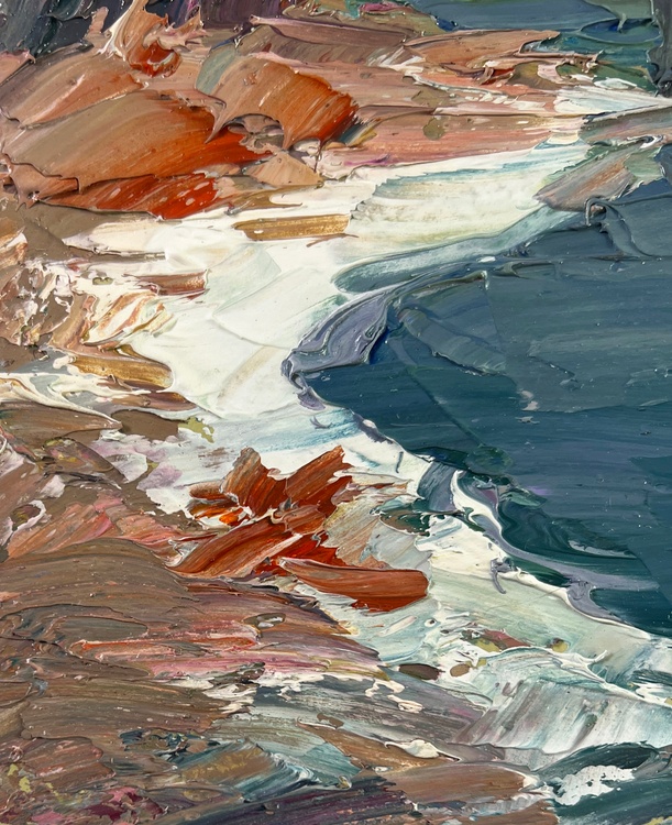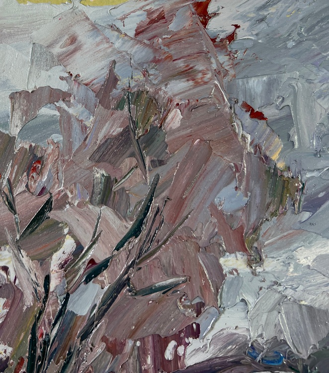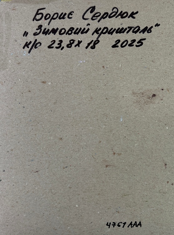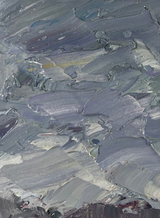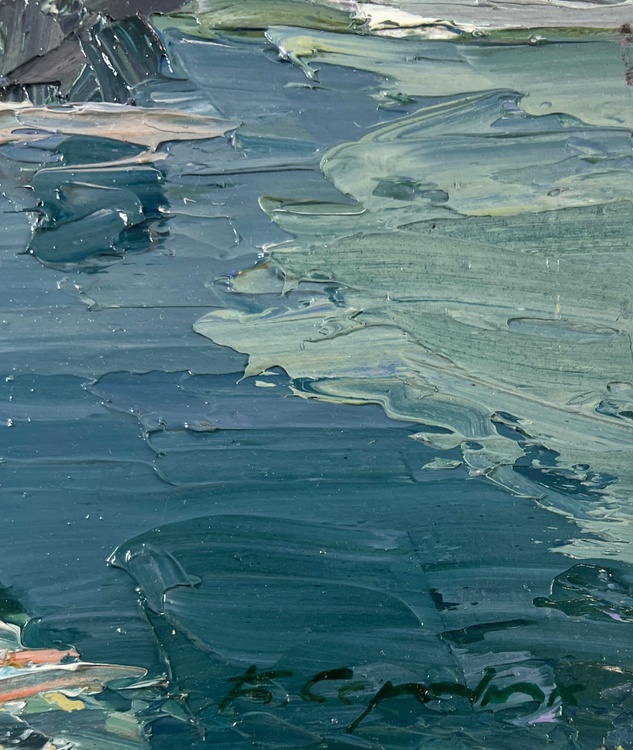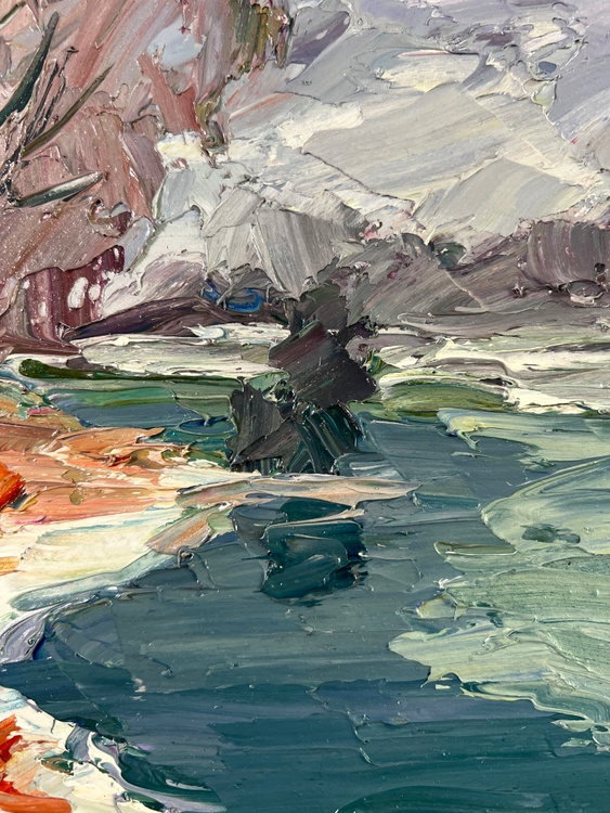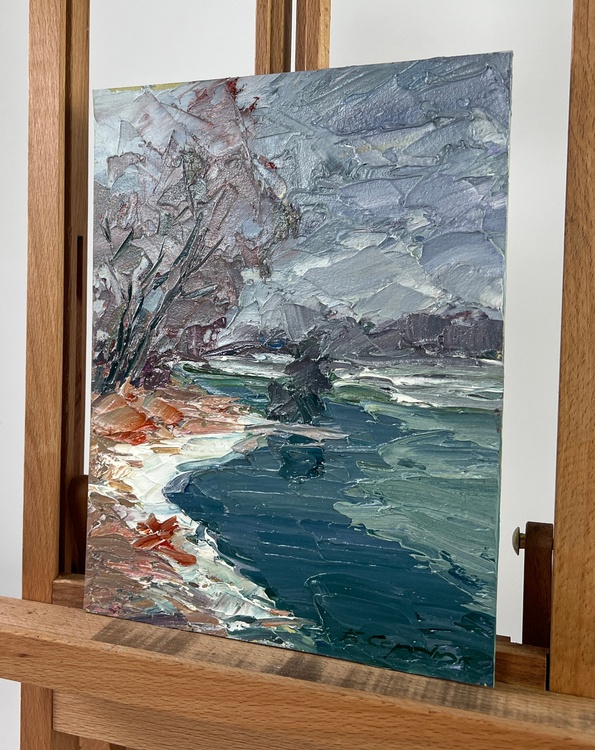 The oil painting on Cardboard titled "River against the backdrop of snowy trees" captures the stark, raw beauty of a winter landscape, where the icy chill of the season meets the tranquil flow of a river. The artist has masterfully depicted the quiet, contemplative mood of a winter day, using a palette dominated by cool blues, deep greens, and muted grays, accented by the occasional warm tone to break the cold monotony. The foreground of the painting features a winding river, its dark, glassy surface reflecting the muted tones of the overcast sky above. The water is rendered with thick, deliberate brushstrokes, creating a sense of movement as it cuts through the snowy landscape. The artist's use of heavy impasto adds a tactile quality to the water, suggesting the weight and depth of the river as it carves its path through the wintry terrain. On the left side, the riverbank is lined with bare, snow-covered trees, their twisted branches reaching up into the steel-gray sky. The trees are depicted in a mix of cool grays and pale whites, their limbs intertwined and layered with thick, textured paint that captures the rough, brittle nature of frozen branches. The bare branches contrast sharply with the dark water below, creating a striking visual tension that draws the viewer's eye into the scene. The snow along the riverbank is painted with a combination of soft whites, cool blues, and touches of warm ochre, capturing the subtle interplay of light and shadow as the weak winter sun struggles to break through the dense cloud cover. The rough, uneven texture of the snow hints at the harshness of the winter landscape, where the elements have shaped the earth into a jagged, unforgiving terrain. In the distance, the trees blend into the misty, gray horizon, their forms becoming less distinct as they recede into the cold, foggy air. The sky above is a swirling mass of cool gray tones, painted with broad, sweeping strokes that convey the turbulent, ever-changing nature of winter weather. This atmospheric effect enhances the feeling of isolation and quiet that permeates the scene, creating a sense of solitude that is both peaceful and haunting. 4761