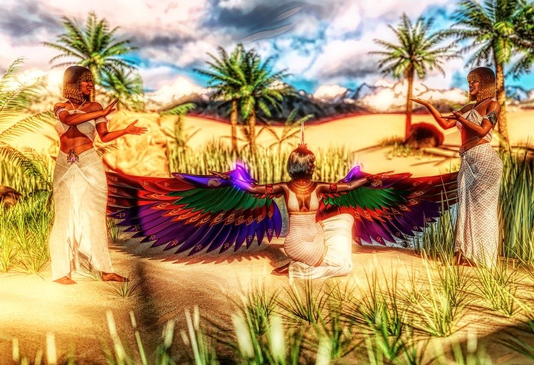 This digital CGI artwork depicts a mystical desert scene with three African women in traditional attire. The central figure, kneeling with her back to the viewer, has striking, large, iridescent wings that blend purple, green, and red hues. She wears a white, beaded, sleeveless top and white, pleated pants, with her dark hair adorned with gold jewelry. Her wings glow with a purple light from the center. Flanking her are two standing women, both with dark skin and gold jewelry, wearing white, sleeveless tops and white, ankle-length, pleated skirts. They have their hands raised in a gesture of reverence or celebration. The background features golden sand dunes, tall green grass, and palm trees, with a blue sky and fluffy white clouds. The distant mountains add depth to the scene. The overall style is realistic with a touch of fantasy, emphasizing the magical nature of the central figure's wings. The lighting is soft, casting gentle shadows that enhance the textures of the sand, grass, and clothing. The composition draws attention to the central figure's wings, highlighting their vibrant colors and mystical glow.