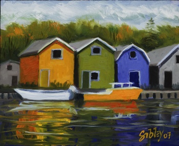 Inspired by a visit to Prince Edward Island and the colourful fishing huts in the harbours. Men working the days catch of lobster or oysters.
