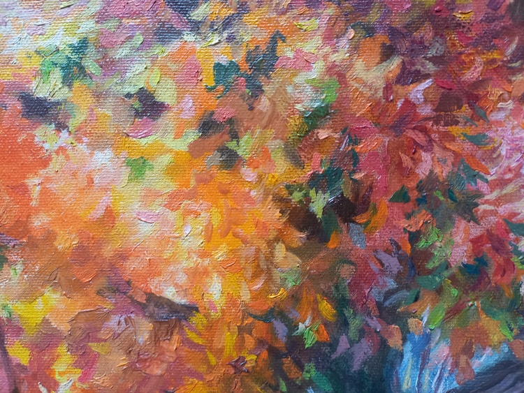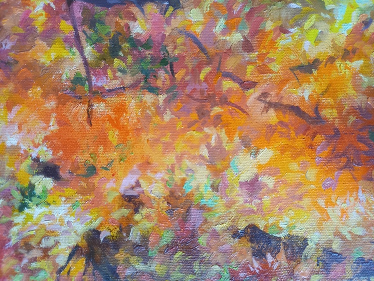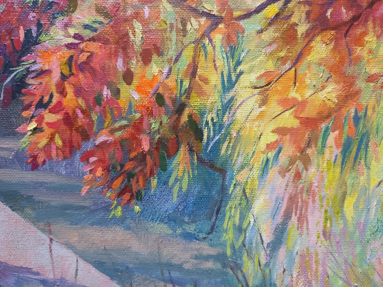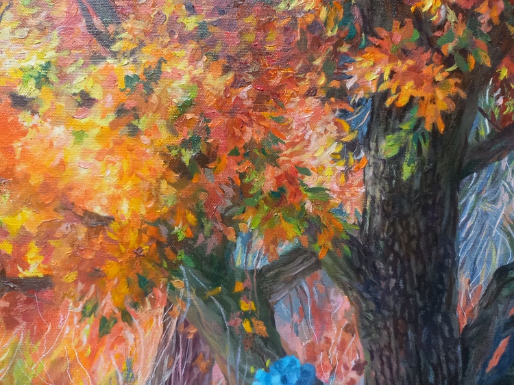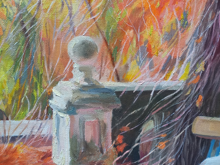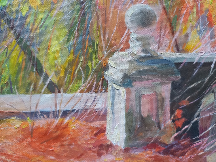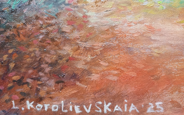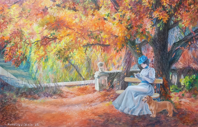 The painting captures a brief, precious moment—the last warm days of the golden autumn, when the old garden still holds a soft glow of the fading season. A woman reading on a bench is immersed in her own quiet space, becoming a natural part of the calm, gently fading landscape. The shimmering autumn foliage enhances the sense of silence and the subtle slowing of time. The dog at her feet adds a touch of domestic warmth and trust. It is a scene of solitude where nature and human presence momentarily fall into the same rhythm.