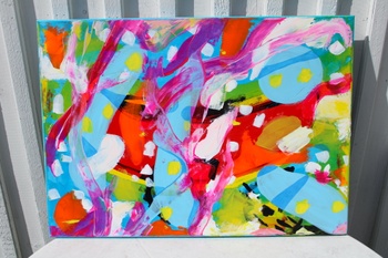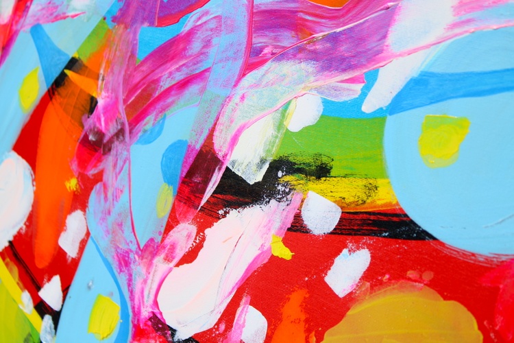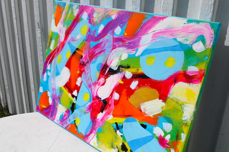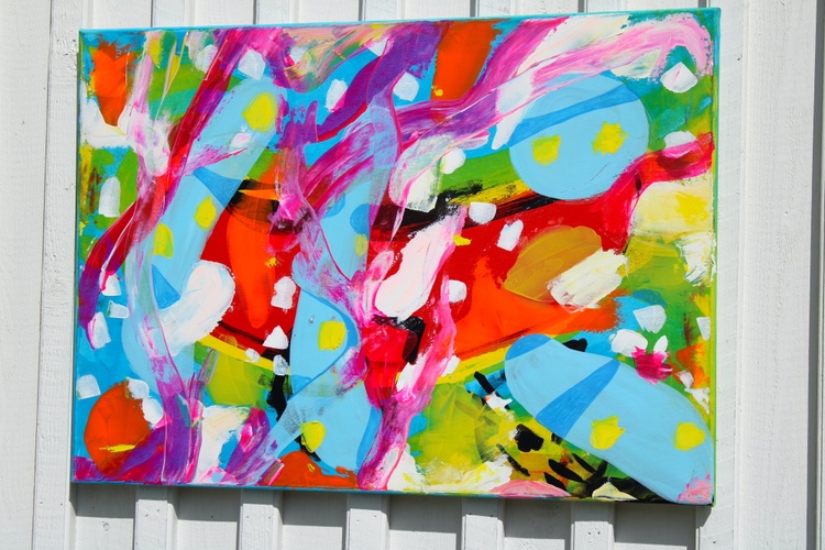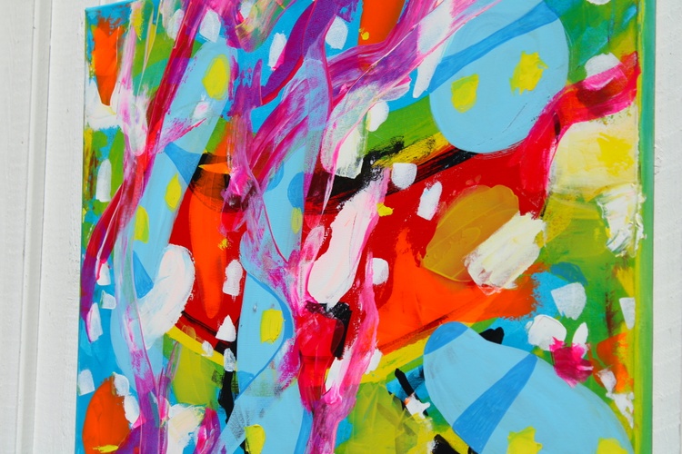Bright reds, sky blues, lemon yellows, fresh greens, and sweeping pink brushstrokes collide and flow across the surface in a rhythm that feels playful and uninhibited. Rounded shapes and gestural lines create a sense of motion, as if colors are dancing freely across the canvas. The composition is bold yet balanced, inviting the viewer to feel energy, curiosity, and creative optimism.