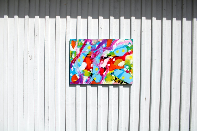 "Banana Rosso" is a lively and expressive abstract painting by Veera Zukova, a contemporary artist based in Ylitornio, Finland. Created with acrylic on stretched canvas, this artwork captures spontaneous movement, layered energy, and joyful color interaction.