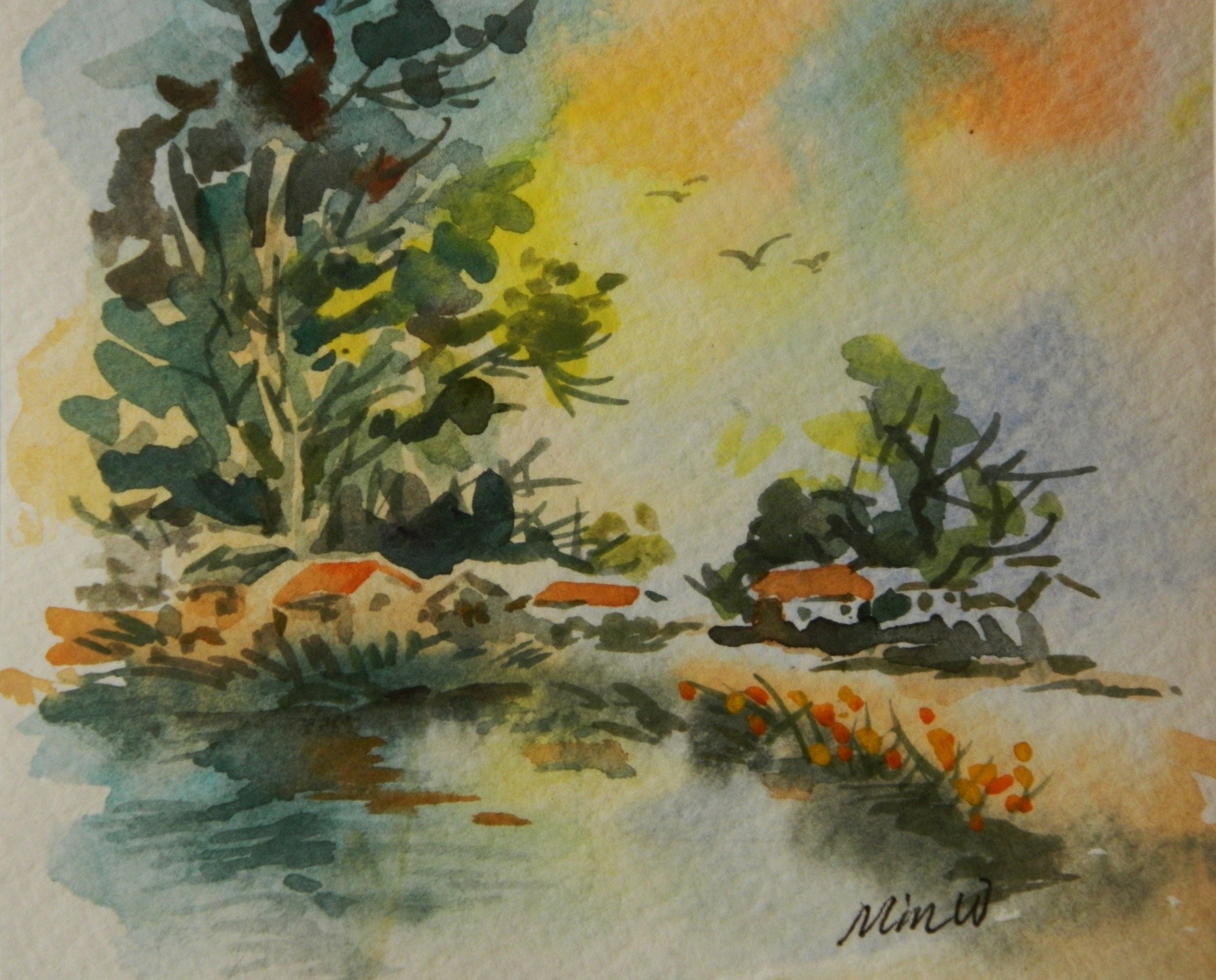 Painted in 2012, this signed original Watercolor impression painting is 4.5" x 4.5". It is painted on artist's cold-press paper. This painting is formally framed, ready for display, and included in the price if purchased. Photos are available upon request of this framed painting. The original painting, if purchased, includes a signed “statement of authenticity” with the Artist’s Biography. This statement can be used by the buyer for insurance, estate planning, personal assets or resale of this painting if so desired. LRB Fine Art reserves all copyrights of the original and/or for reproductions. Reproductions on canvas can be purchased at: https://fineartamerica.com/profiles/min-w or www.artpal.com/ontap456