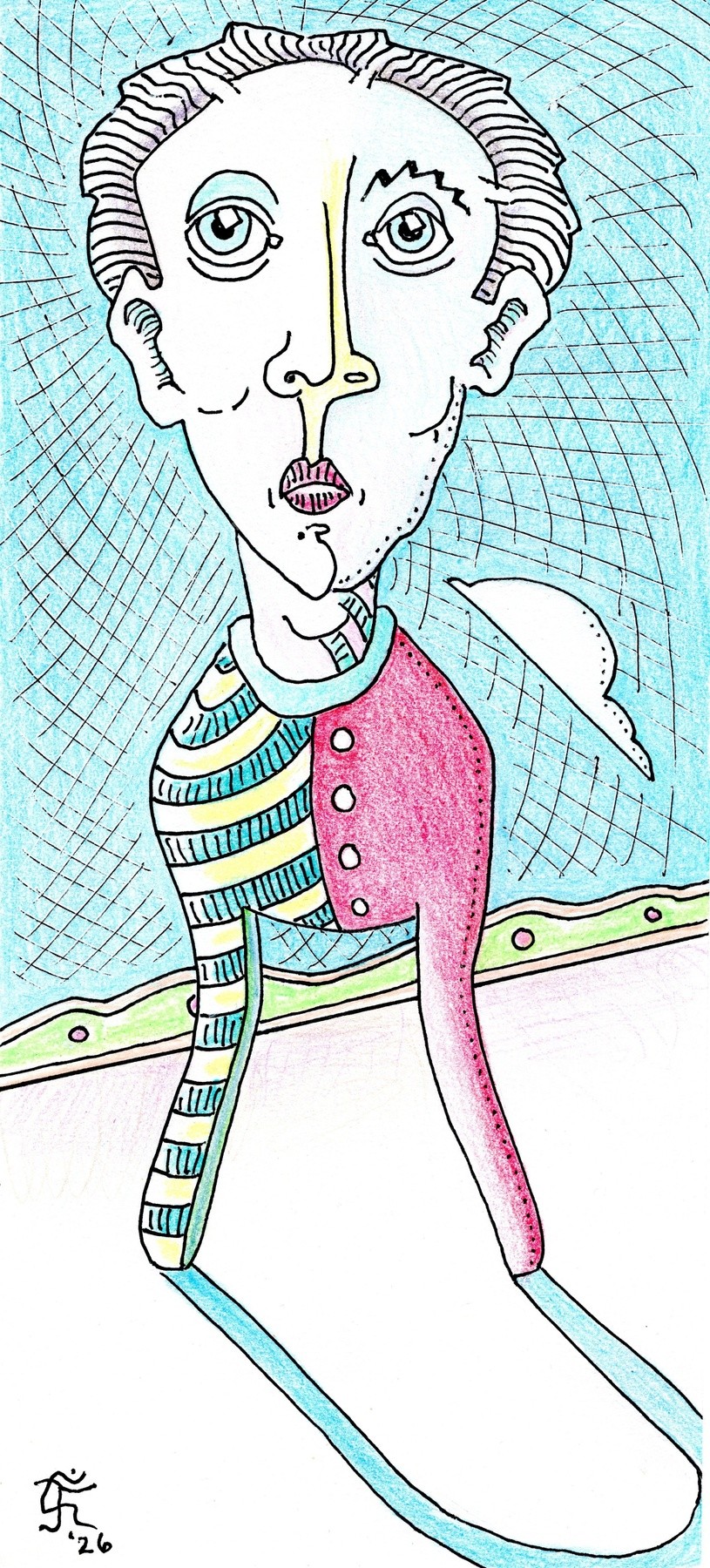 Is this little fellow a stand-in for the Charles that was or the Charles who will be? Ah, that's the question, the rub, etc. This is a 9 by 4 inches gel pen with color pencil drawing on medium bond acid-free paper. If you want to be amused slide one of my images into Google Lens and see what AI spits out. Most entertaining for Original Jones Art in northwest Austin, Texas.