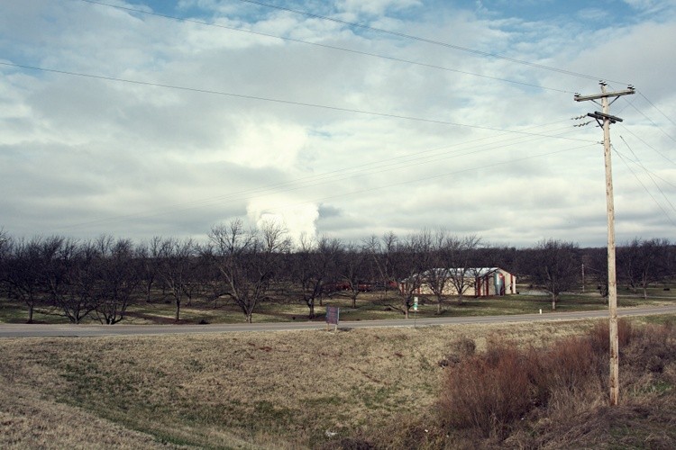 A quiet rural scene featuring a road, electric pole, and a grove of bare trees under a partially cloudy sky. The horizon reveals a small barn-like structure surrounded by fields.