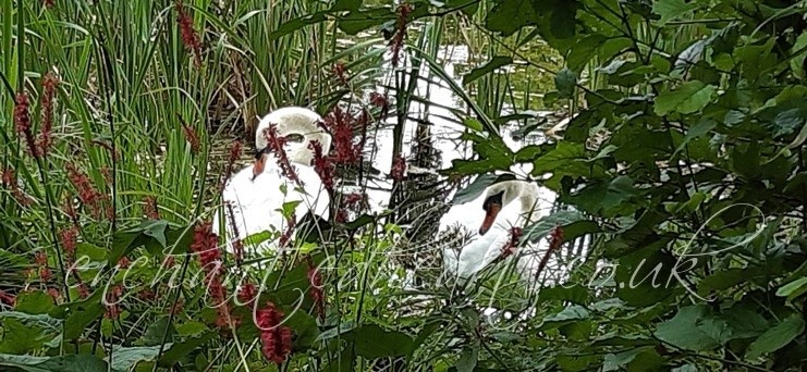 Two beautiful swans hidden among the flora on a serene lake. Photograph.