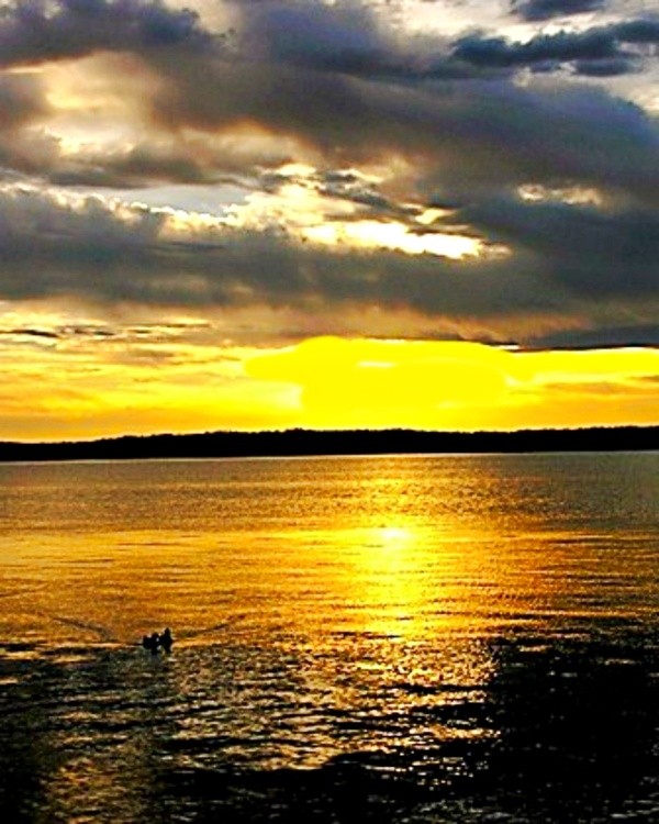 A stunning golden sunset casts a warm glow over the Potomac. Clouds scattered across the sky create dramatic contrasts, enhancing the serene atmosphere.