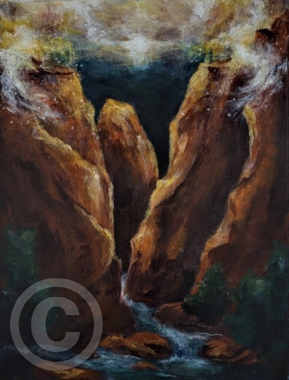This is a painting of a storm moving in over the Black Canyon at sunset.The canyon is located just outside of Gunnison Colorado, heart of the Rocky Mountains. The cliffs are steep and the river runs very cold and deep. It is a very popular tourist destination with incredible views. A stunning scene of a deep canyon with sheer, towering rock formations. A small stream winds through the base, framed by lush greenery.