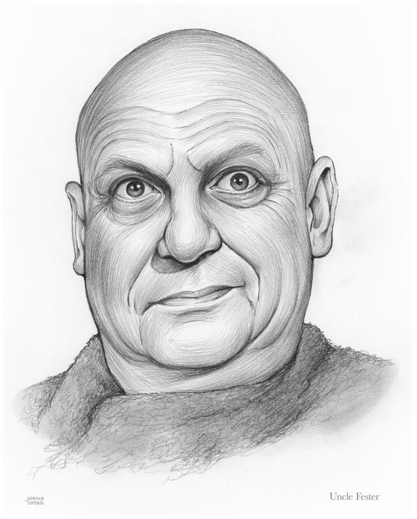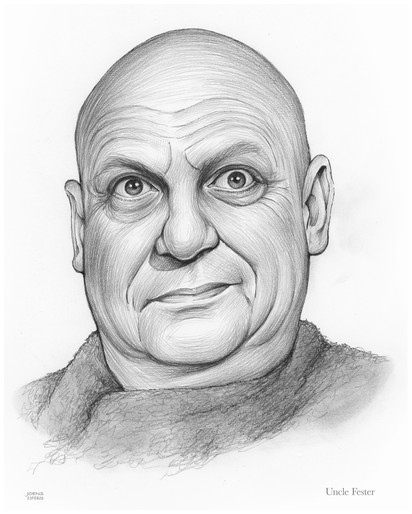 Uncle Fester is the gleefully ghoulish, wild-eyed uncle from the classic 1960s TV series The Addams Family. Originally portrayed by Jackie Coogan, Fester is known for his bald head, sunken eyes, and infectious cackle. A proud Addams, he delights in bizarre experiments, can conduct electricity through his body, and shares his family’s macabre sense of humor and deep loyalty. Though outwardly spooky, Fester is warm-hearted and fiercely devoted to his relatives, embodying the show’s playful celebration of the unconventional. Pencil portrait by Greenville artist Greg Joens captures his iconic, offbeat charm with striking detail.