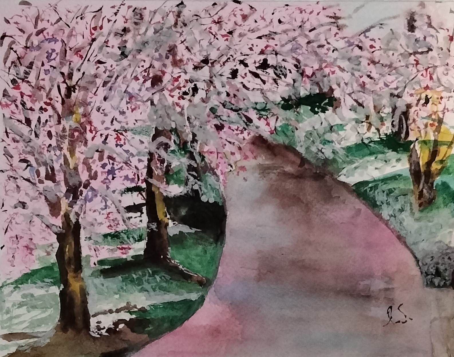 Unexpected snow came when fruit trees were in bloom. Wild combination of pink flowers, white snow and green grass, Pleasant reflections on wet road. Nice topic for watercolor practice.