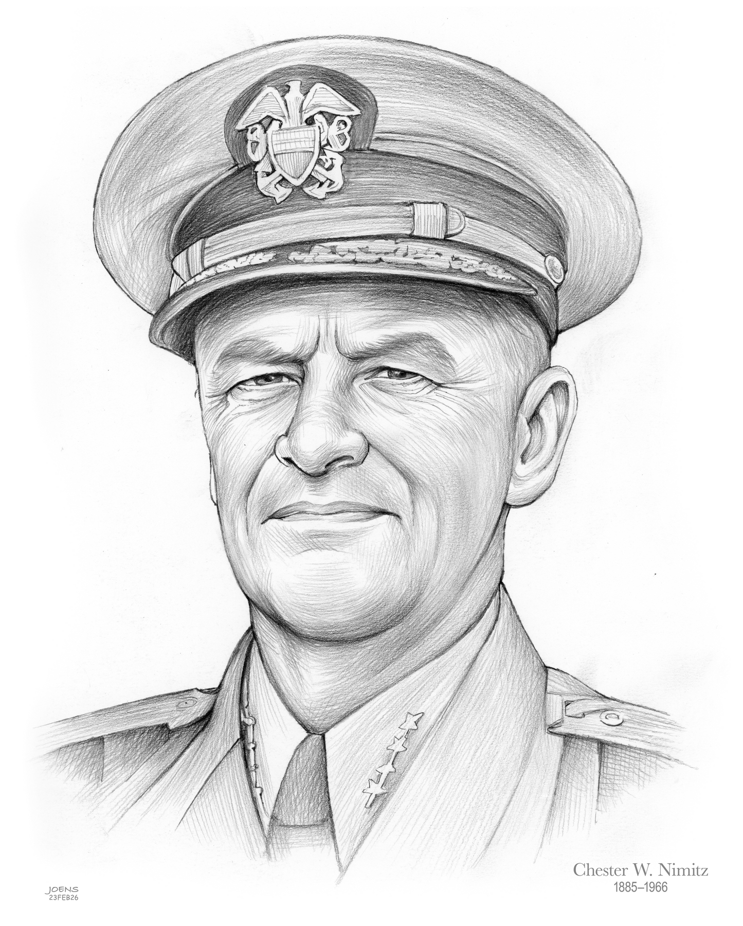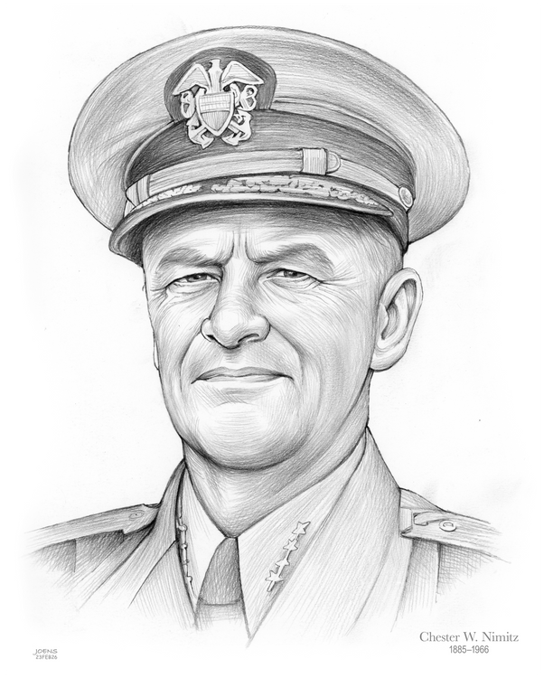 Admiral Chester W. Nimitz, born February 24, 1885, in Fredericksburg, Texas, remains one of America’s greatest naval leaders. As Commander in Chief of the U.S. Pacific Fleet during World War II, his calm resolve and strategic brilliance were instrumental in securing victory across the Pacific. Nimitz’s legacy of duty, humility, and quiet courage continues to inspire sailors and citizens alike. He passed away on February 20, 1966, in San Francisco, California, just days before his 81st birthday. This tribute is accompanied by a finely rendered pencil drawing in his likeness by artist Greg Joens, honoring his enduring memory.