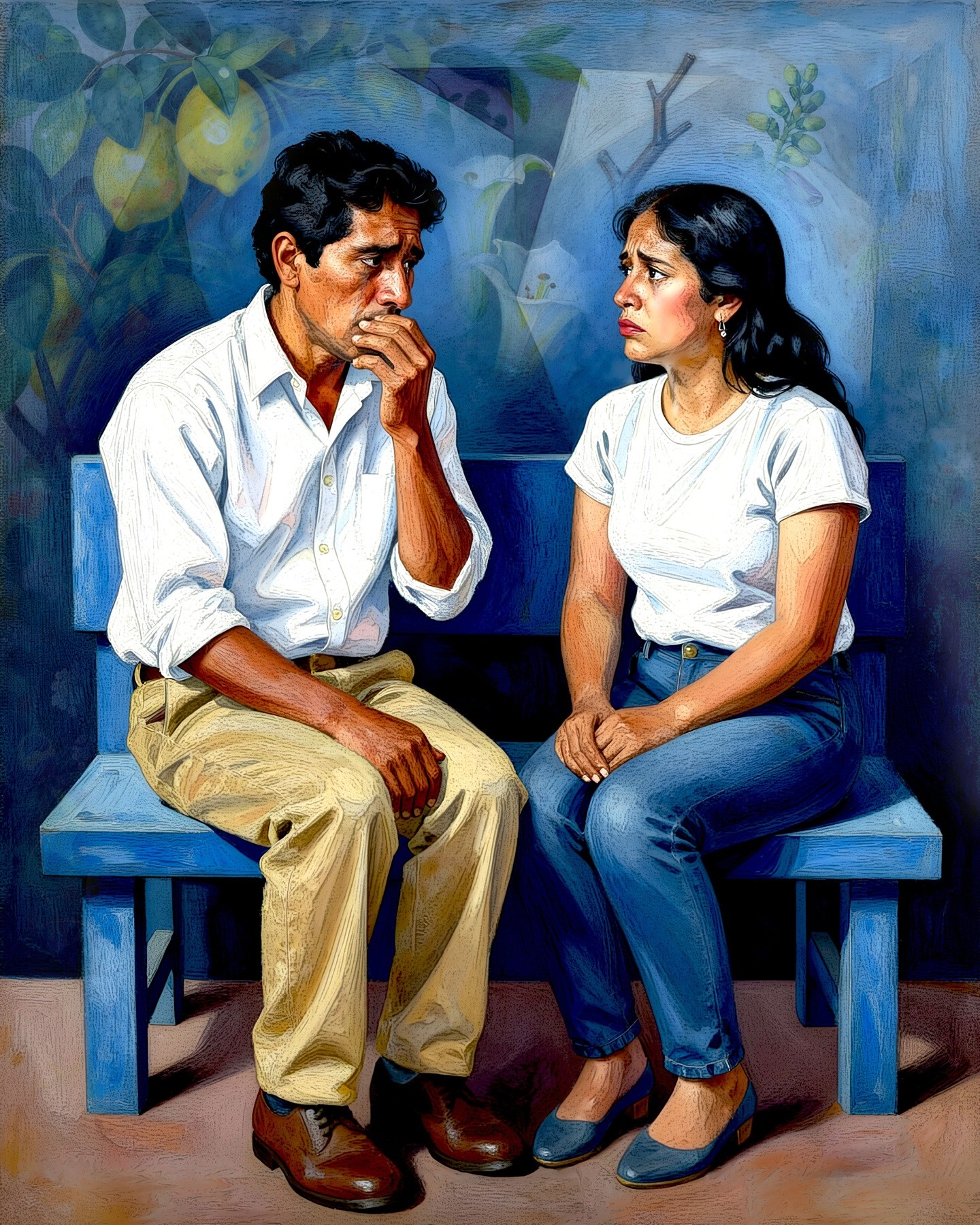 Latino couple sitting on blue bench. One asking for forgiveness of the other.