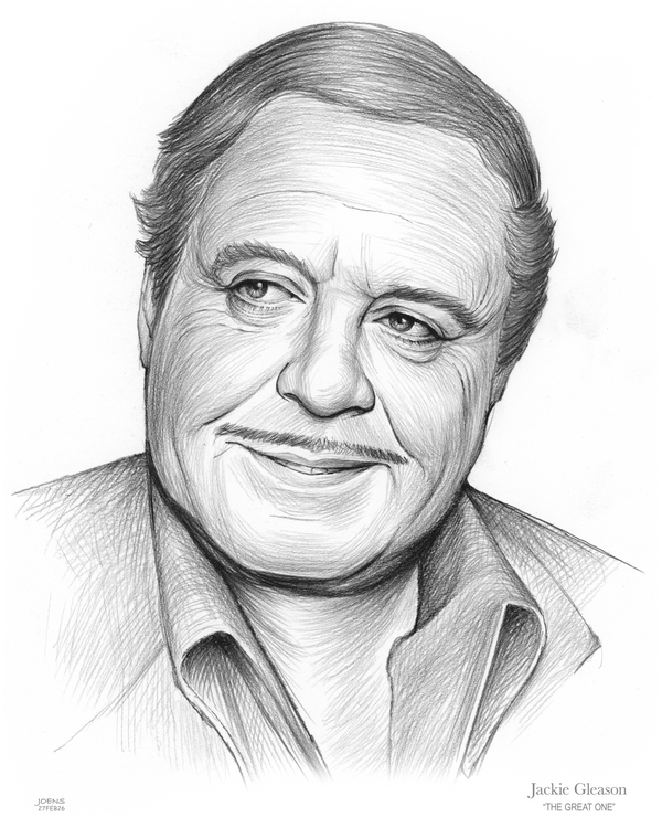Jackie Gleason (February 26, 1916 – June 24, 1987) was a legendary American actor, comedian, and musician whose larger-than-life presence helped define early television comedy. Best known for creating and starring in The Honeymooners, Gleason brought working-class characters to life with heart, humor, and honesty. His impeccable timing, expressive face, and unforgettable catchphrases influenced generations of comedians and sitcoms. Beyond television, he was acclaimed for his dramatic film roles and his popular mood-music recordings. Jackie Gleason’s enduring legacy continues to shape the entertainment industry. Pencil sketch tribute artwork by artist Greg Joens.
