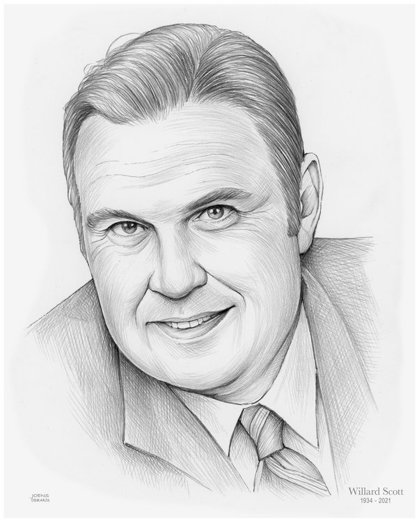 Willard Scott (1934–2021) was a beloved American television personality, best known for his warm, joyful presence on NBC’s Today show. Beginning his career in broadcasting as a radio host and children’s show performer, Scott’s big-hearted humor and approachable style made him a household favorite. He famously portrayed Ronald McDonald in early McDonald’s commercials and later became the Today show’s iconic weatherman, delighting viewers with his spirited forecasts and heartfelt 100th-birthday salutes to centenarians across the nation. Scott’s enthusiasm, kindness, and genuine affection for everyday people helped redefine what it meant to be a TV personality, blending news, entertainment, and human connection. His legacy endures in the many lives he touched with his laughter and compassion. Portrait art by Greg Joens, whose drawing honors Scott’s warmth and character with sensitivity and style. www.GregJoens.com