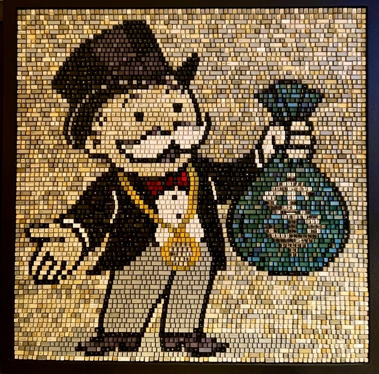 58 x 58 Currently featured and available at Quidley and Company Fine Art Gallery located in beautiful Naples, Florida. Rich Uncle Pennybags, the Monopoly Man, is a timeless symbol of ambition, strategy, and American capitalism reimagined as a fine-art mosaic crafted from 5,000 recycled computer keys, embedding a hidden word search that reflects the language of risk, wealth, and ownership. There is a word search spelled out with the keys hidden throughout the artwork. DO NOT PASS GO JUST VISITING COLLECT $200 GET OUT OF JAIL FREE PAY LUXURY TAX PASS GO COMMUNITY CHEST FREE PARKING GO TO JAIL ADVANCE TO GO CHANCE MORTGAGE RAILROAD BUY BUILD CONQUER UTILITIES OWN IT ALL PROPERTY IS POWER FORTUNE FAVORS THE BOLD BUY CASH IS KING STACK THE DECK MONEY TALKS RISK AND REWARD THE HOUSE ALWAYS WINS PLAY TO WIN WIN BIG OWN THE BOARD MAKE YOUR MOVE RULE THE GAME